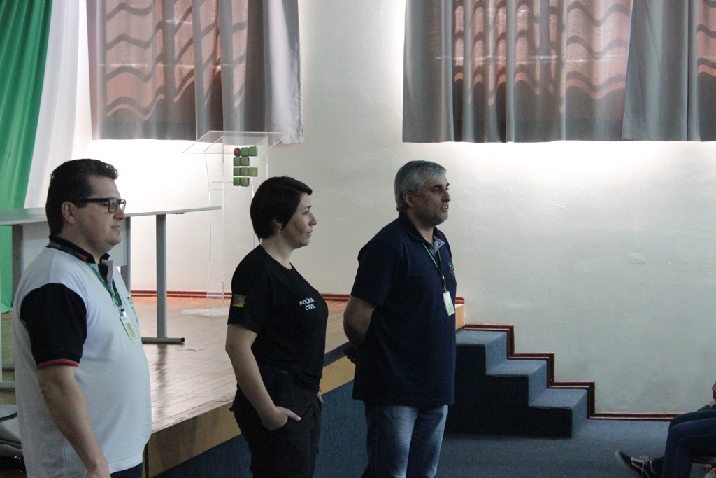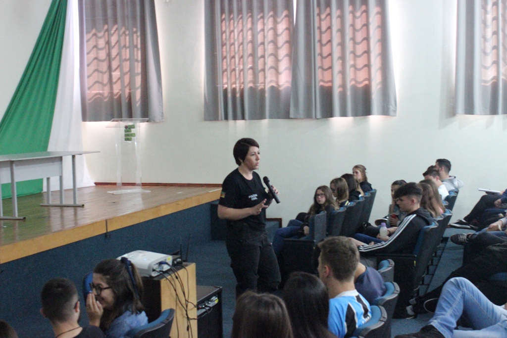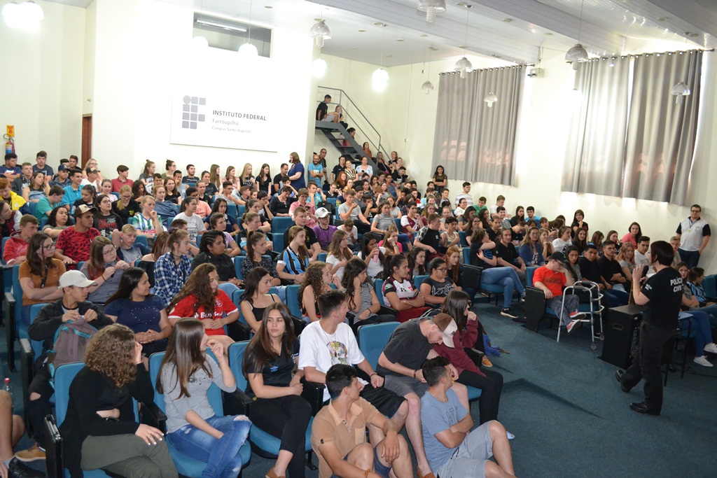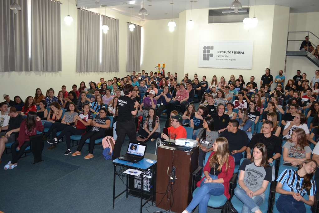 Os estudantes dos cursos técnicos integrados ao ensino médio do IFFar – Campus Santo Augusto receberam nesta quinta-feira, dia 24, a Delegada Caroline Bamberg Machado, responsável pela Delegacia Regional de Cruz Alta, para uma atividade alusiva ao Dia Nacional da Segurança e Saúde nas Escolas (10 de outubro), organizada pela Direção de Ensino, através dos setores de Assessoria Pedagógica e da Coordenação de Assistência Estudantil.