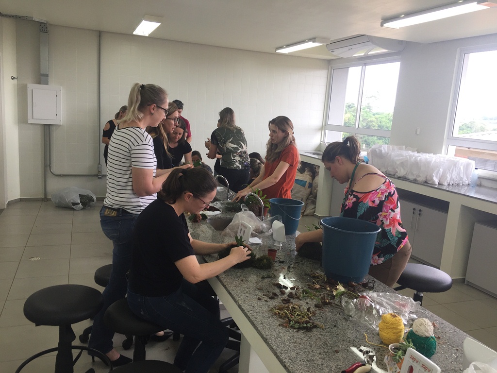 Encerrando as atividades da Quinzena, no dia 30 de outubro, das 13h15 às 14h45, aconteceu a oficina de Kokedamas, ministrada pelo professor Tarcísio Samborski, onde foram produzidos arranjos com plantas de diferentes espécies. Após a oficina, os servidores participaram da reunião geral e ao final foram convidados para uma pequena confraternização pela passagem do Dia do Servidor.