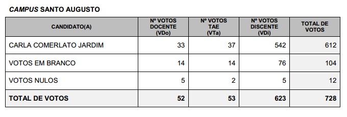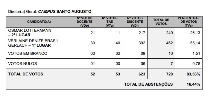 A candidata Verlaine Denize Brasil Gerlach foi reeleita, nesta quinta-feira, dia 30 de junho, Diretora Geral do Campus Santo Augusto para um mandato de quatro anos.