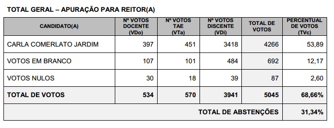 A Reitora Carla Comerlato Jardim também foi reeleita para um mandato de mais quatro anos.