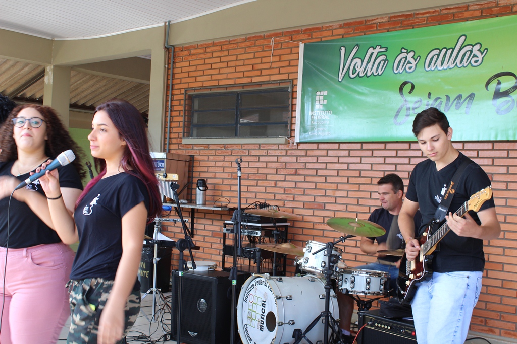 Entre uma fala e outra a Banda IF Musical abrilhantou as atividades da manhã de acolhida. Após o lanche, calouros e veteranos de todos os cursos participaram de atividades de integração coordenadas pelo Grêmio Estudantil Honestino Guimarães, com muita música, dança e descontração.