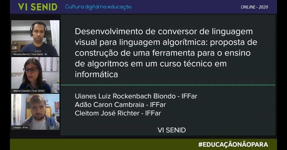 De 22 a 24 de abril foi realizado o VI Senid - Seminário Nacional de Inclusão Digital, pela primeira vez totalmente online em virtude da pandemia de Covid 19, contando com mais de 5 mil participantes. O Senid é organizado pela Universidade de Passo Fundo – UPF, com o apoio de outras instituições de ensino, dentre elas o IFFar, através do Campus Santo Augusto.