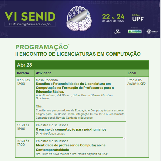 Pela manhã ocorreu a mesa Redonda: “Desafios e potencialidades da Formação de professores de Computação para a Educação Básica”, composta pelos professores: Dr. Adão Caron Cambraia (IFFar); Dr. Christian Backmann (IFFar); Dr. Sidinei Renato da Silveira (UFSM); Msc. Wilk de Oliveira (USP). De tarde ocorreu a palestra do professor Dr. André Souza Lemos (IFTM). Após a palestra do Dr. André, as professoras Dr. Lilian Teixeira e Dr. Marcia Cruz proferiram a palestra “Identidade do professor de Computação na contemporaneidade”.