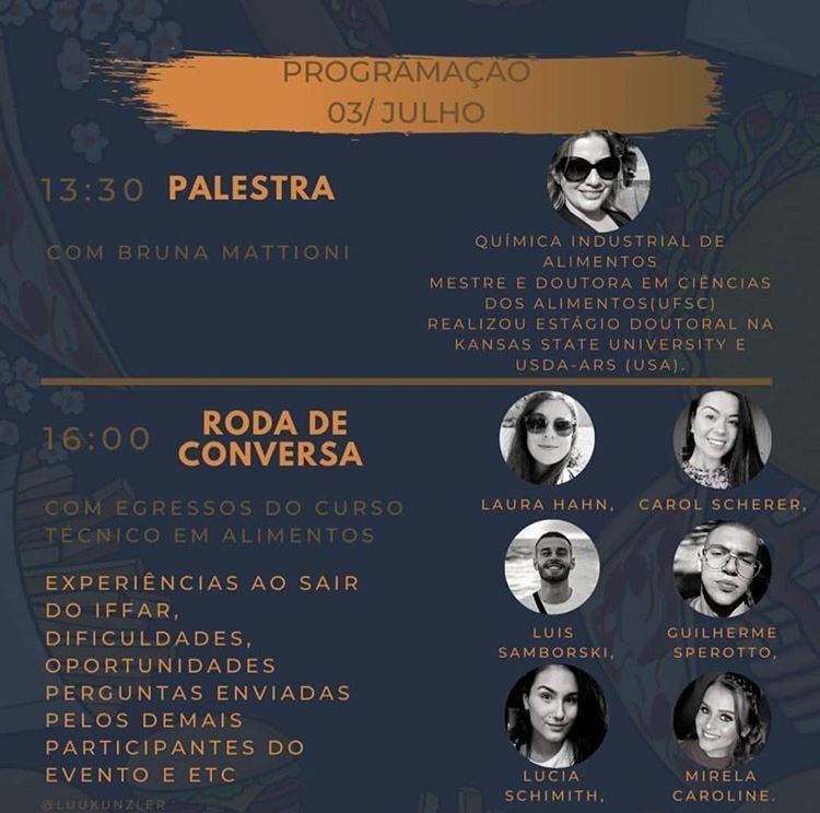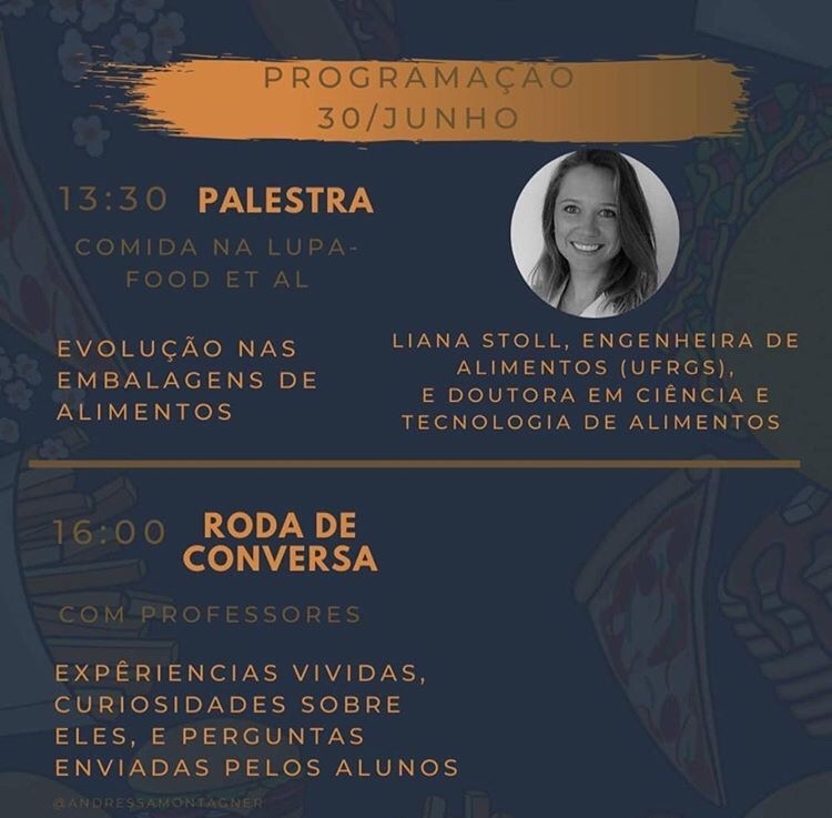 O evento teve início no dia 30 de junho, com a palestra online “Evolução nas embalagens de alimentos”, ministrada pela Engenheira de Alimentos, Drª Liana Stoll. Em seguida aconteceu a Roda de Conversa com professores do curso, onde foram relatadas experiências vividas, curiosidades e foram respondidas perguntas dos alunos.
