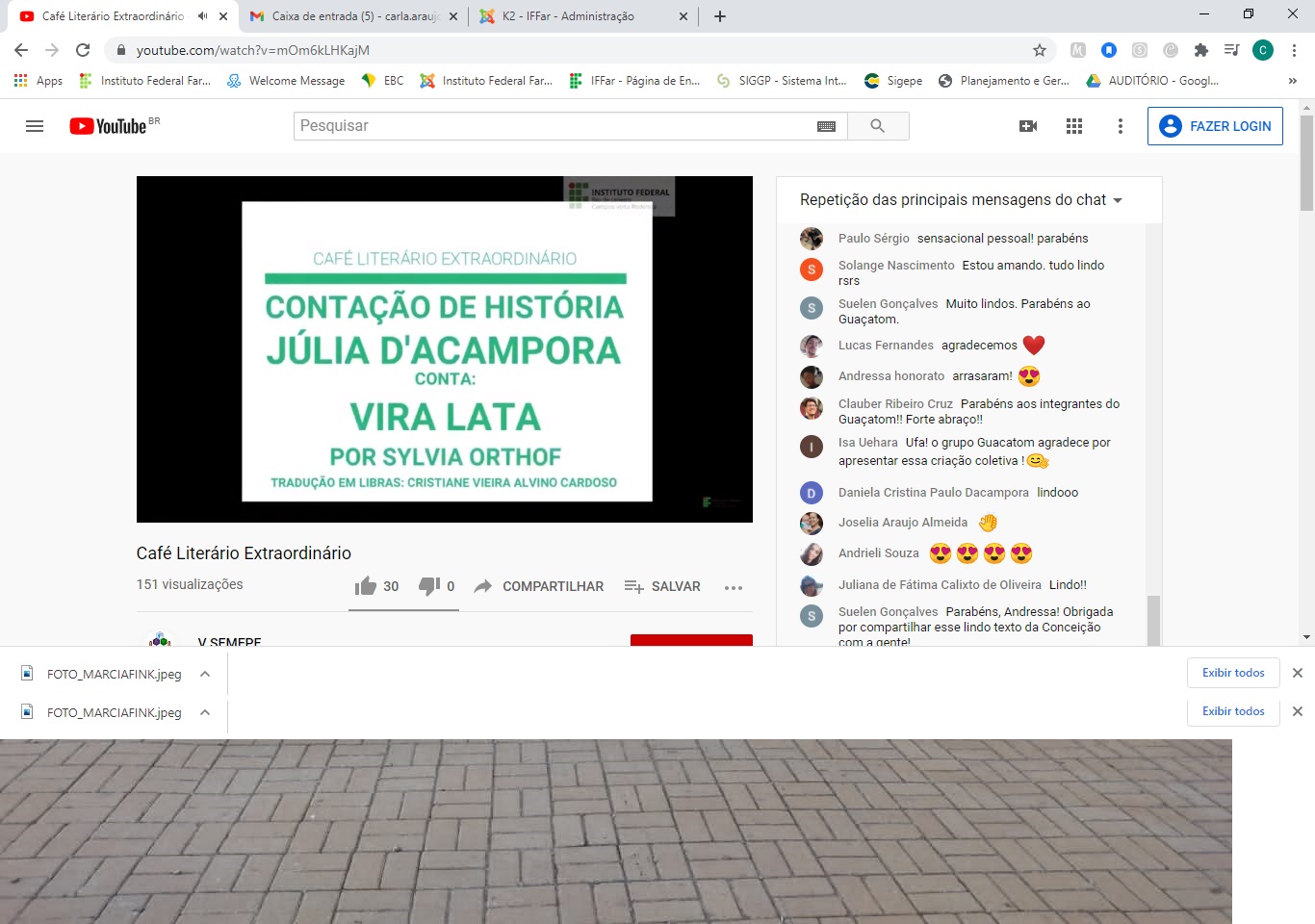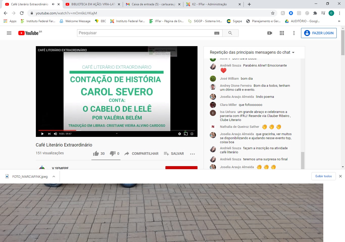 Na segunda-feira, dia 30 de novembro, os projetos de extensão desenvolvidos no IFFar – Campus Santo Augusto, “Biblioteca em Ação: Contar, Encantar e Educar em tempos de quarentena” e “Tampatas - junte e ajude” estiveram representados no VI Café Literário Extraordinário, realizado dentro da programação do V SEMEPE - Semana de Ensino, Pesquisa e Extensão do Instituto Federal Rio de Janeiro – IFRJ Campus Volta Redonda. O evento, que tem como tema “Ciência, Educação e Tecnologia para a redução das desigualdades”, acontece de forma online e conta com palestras, minicursos, oficinas, exposições e atividades culturais (https://www.youtube.com/watch?v=mOm6kLHKajM)