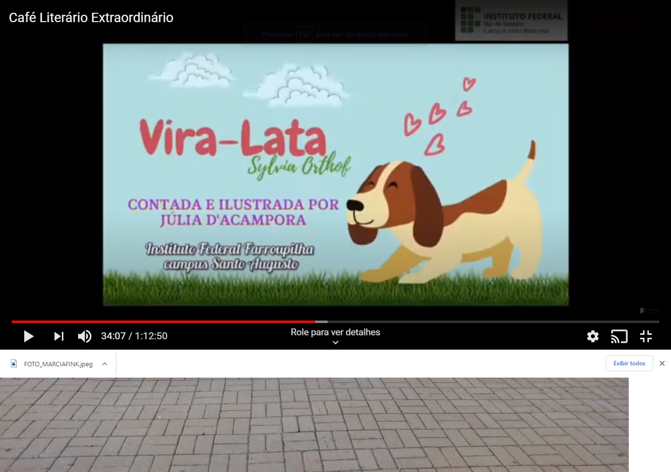 As histórias escolhidas por Cíntia foram: O Cabelo de Lelê da autora Valéria Belém, Ilustrado e contado pela aluna Carol Severo do curso de Licenciatura em Ciências Biológicas e a história Vira - Lata da autora Sylvia Orthof , ilustrado e contado pela aluna Júlia d'Acampora do curso Técnico em Alimentos (ambas as histórias estão disponíveis no canal no youtube do projeto). A história Vira-Lata foi feita em parceria com o projeto “TAMPATAS - junte e ajude”, coordenado pela professora Camila Copetti, e envolveu mediação de leitura e conscientização ambiental.