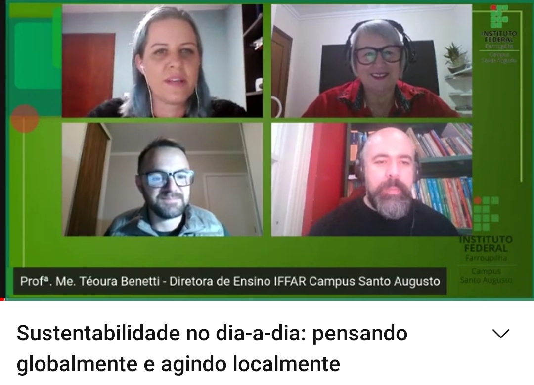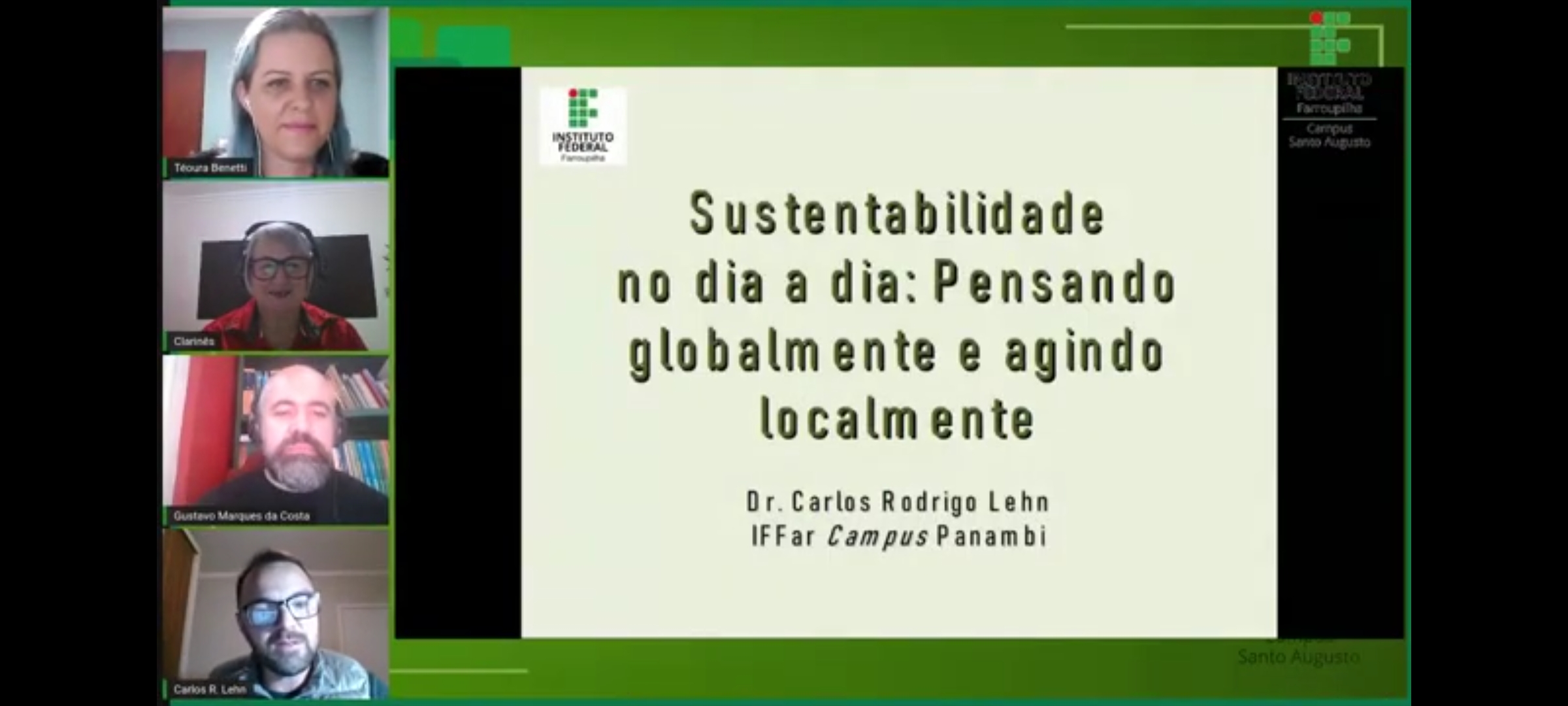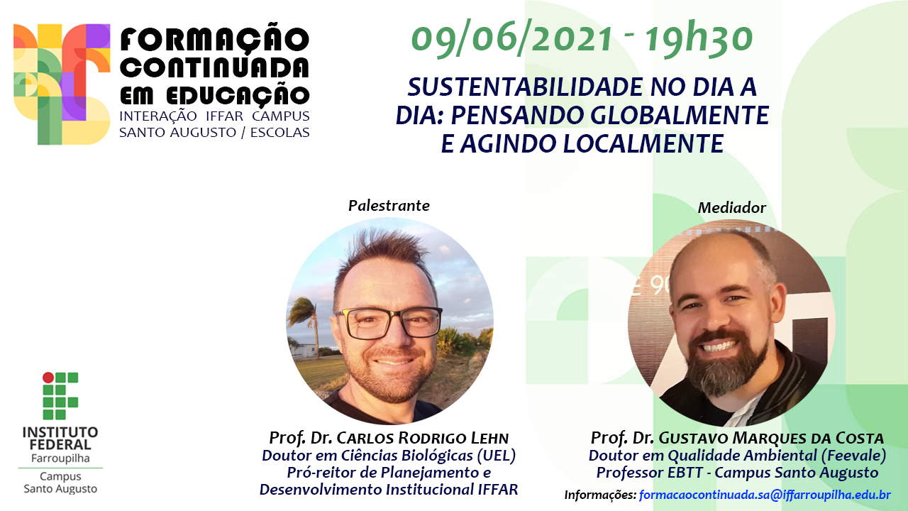 A formação teve início no dia 09, às 19h30, com a palestra "Sustentabilidade no dia a dia: pensando globalmente e agindo localmente", ministrada pelo Pró-reitor de Planejamento e Desenvolvimento Institucional do IFFar, professor Dr. Carlos Rodrigo Lhen, mediada pelo professor Dr. Gustavo Marques da Costa. A abertura do evento contou com a participação da Diretora de Ensino do Campus Santo Augusto, Téoura Benetti, e da representante da Comissão Organizadora da Formação, professora Clarinês Hames.
