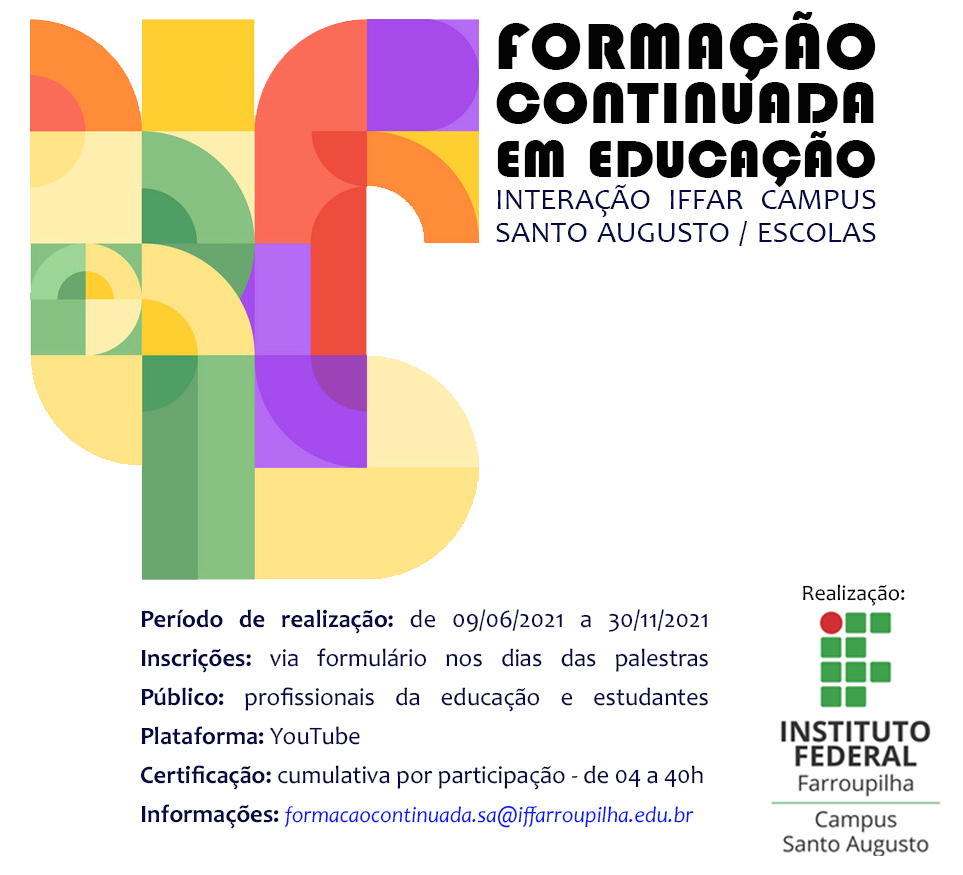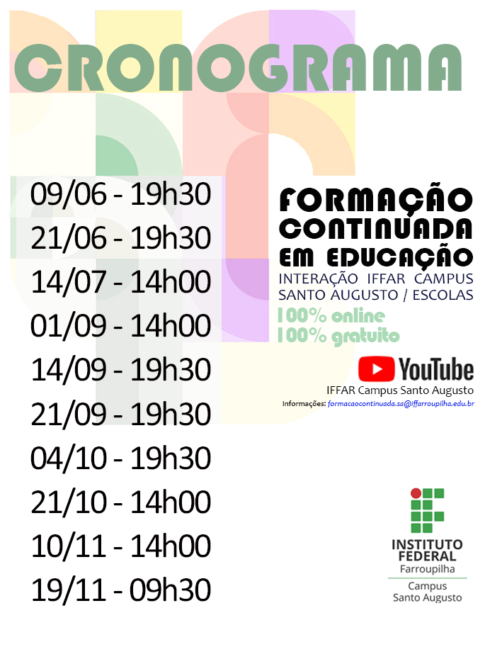 O IFFar – Campus Santo Augusto está promovendo o Curso de Extensão online “Formação Continuada em Educação - Interação IFFar/Escolas”, de 09 de junho até 30 de novembro, com carga horária de 40h, pelo canal institucional no Youtube (https://www.youtube.com/channel/UCX7KfGe-9GstsUQszpO4p_A).
