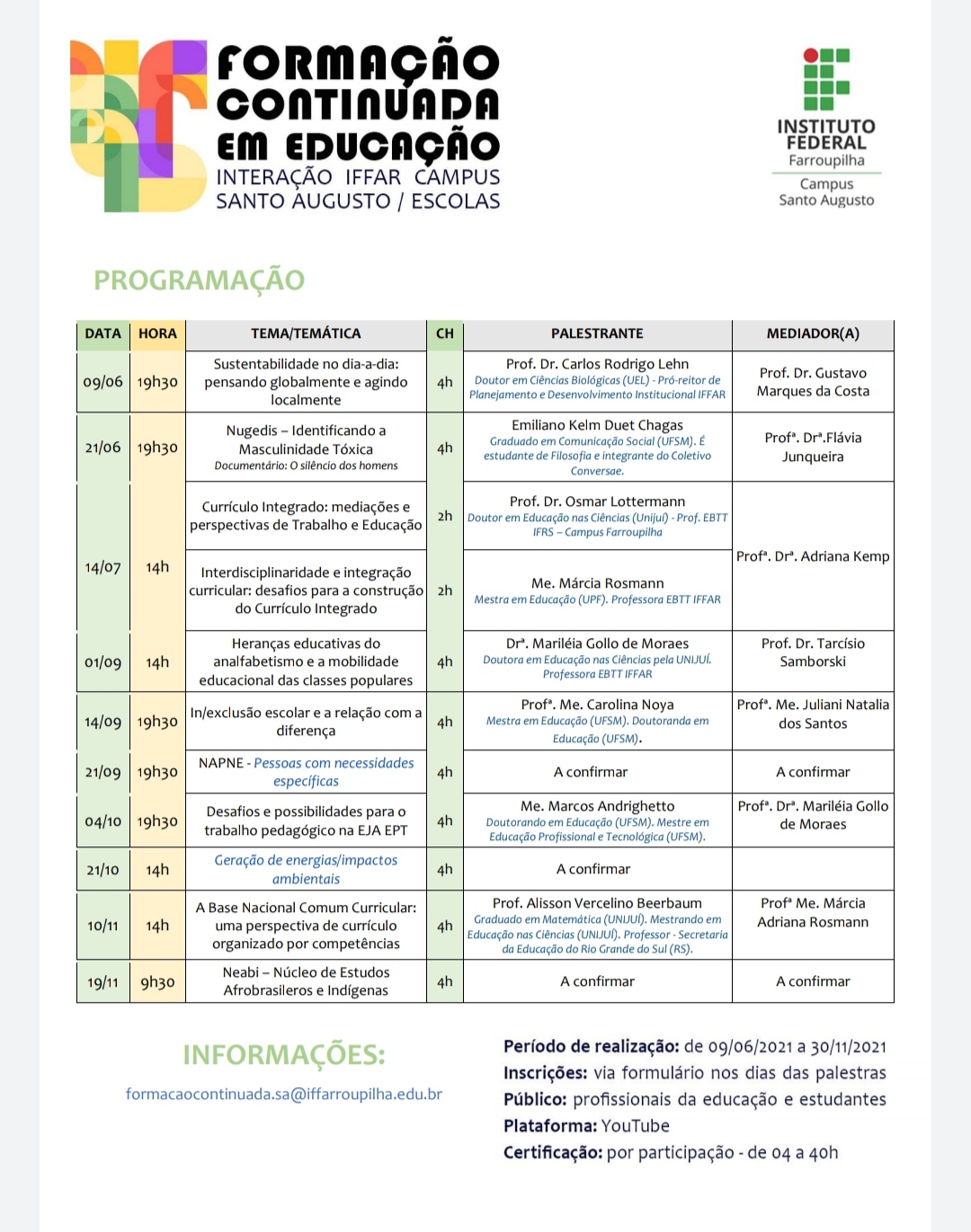 O curso que visa ofertar uma discussão qualificada de formação, aos servidores, docentes e técnicos administrativos em educação, estudantes do ensino médio e superior do IFFar - Campus Santo Augusto, e, em especial, para a comunidade externa, configurada por professores das redes públicas de ensino municipais e estadual de Santo Augusto (RS) e Região, compreendendo palestras e mesas redondas com a abordagem de temáticas de amplo conhecimento e especificidades relativas à educação como um todo: Meio Ambiente, questões de gênero, Currículo (BNCC, Currículo Integrado), Inclusão Social, Educação de Jovens e Adultos, Trabalho Docente.