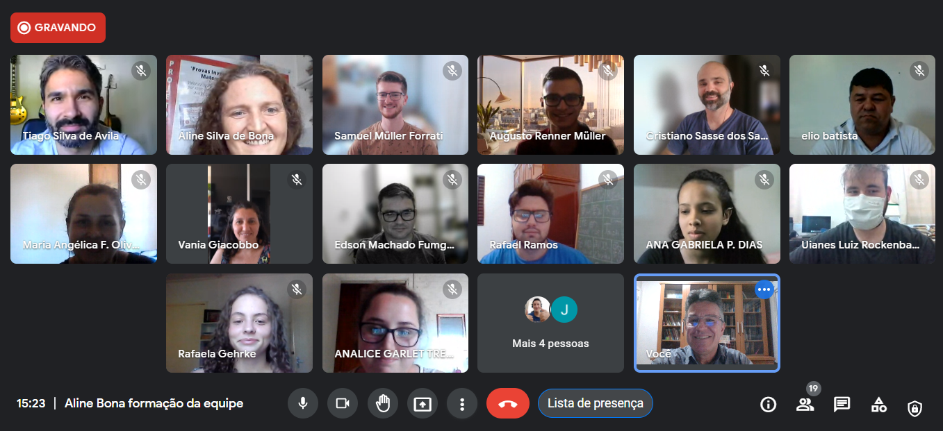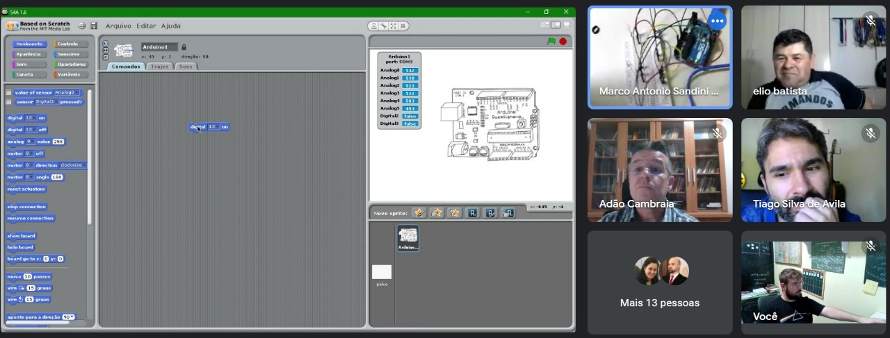 O primeiro encontro online do projeto aconteceu no dia 06 de dezembro, através da formação conjunta com a equipe do Campus de Júlio de Castilhos, coordenada pela professora Drª. Angélica Oliveira, tendo como tema “Metodologias Ativas com programação Scratch”, ministrado pela professora do IFFar, Maria Angélica Figueiredo de Oliveira. O segundo encontro aconteceu no dia 08 de dezembro, com o tema “Computação desplugada”, ministrado pela professora Dr. Aline Bona do IFRS. O terceiro encontro aconteceu no dia 10 de dezembro, com o tema “Scratch para robótica”, ministrado pelo professor da UPF, Dr. Marco Trentin. O quarto e último encontro será no dia 17 de dezembro, com o tema “Momentos pedagógicos e projetos integrados com Scratch”, ministrado pelo servidor do Campus Santo Ângelo, Rodrigo Thomas (mestrando do ProfePT/IFFar) e pelo professor municipal e bolsista do projeto Uianes Biondo (egresso da Licenciatura em Computação do Campus Santo Augusto atualmente mestrando na UFSM).