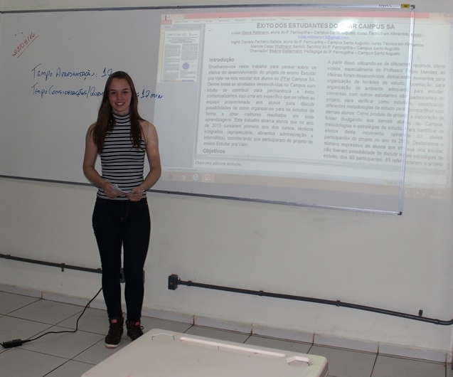 O Campus Santo Augusto também foi destaque, com o trabalho que obteve o 3º lugar na modalidade ensino,“Pensando estratégias para estudar melhor: alguns efeitos do desenvolvimento de Projeto de Ensino do IFFar Campus Santo Augusto”, apresentado pela aluna Ingrid Pacheco, sob orientação da pedagoga Beatris Gatermann. O trabalho foi produzido pelas alunas Ingrid Pacheco e Luiza Retmann a partir do Projeto de Ensino Estudar pra Valer, desenvolvido desde ano de 2015, com objetivo de estimular os estudantes dos primeiros anos dos cursos técnicos integrados ao ensino médio a identificar e utilizar no dia a dia diferentes estratégias de estudo.
