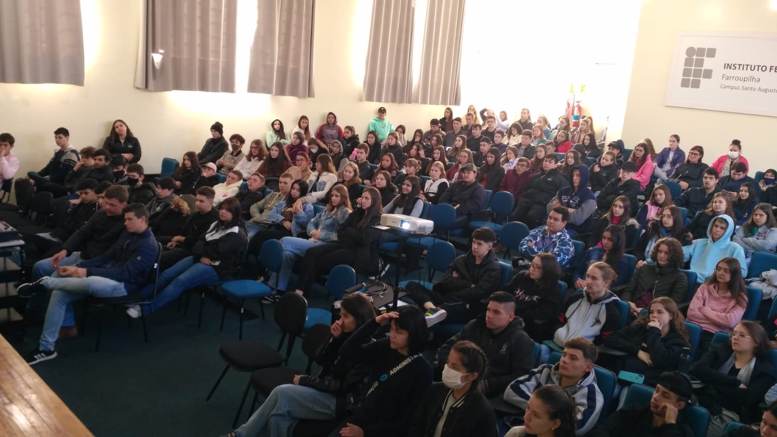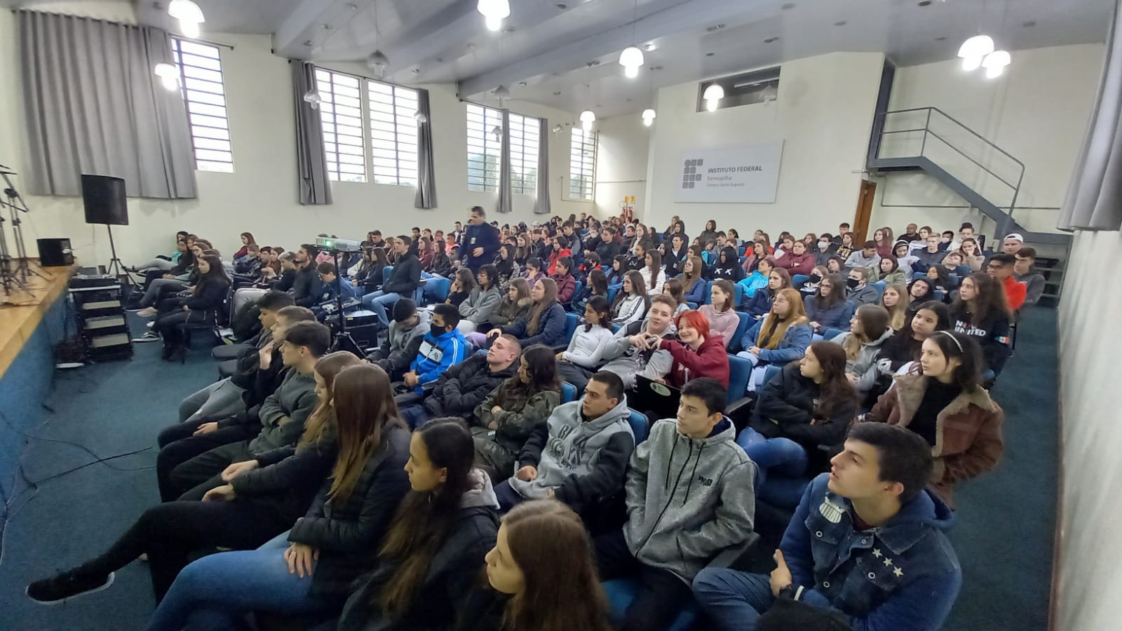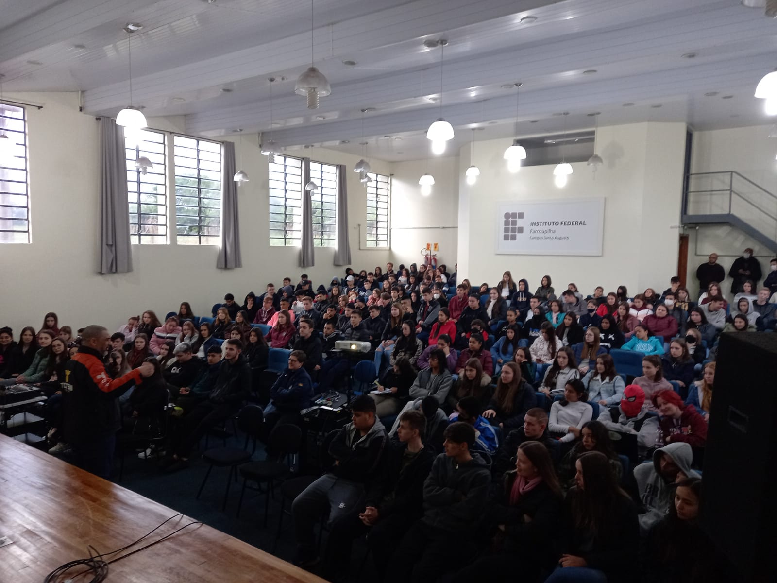 Os estudantes dos cursos técnicos integrados ao ensino médio do IFFar – Campus Santo Augusto participaram na manhã de hoje, 12 de maio, de palestra com o tema Vida de Estudante, ministrada pelos Sócios Diretores do Totem Vestibulares, Rafael Levy (formação em Matemática e Pedagogia) e Warner Audino Fagundes (formação em Biologia). A atividade foi pensada pelo Núcleo de Saúde Mental da instituição em conjunto com a Coordenação de Assistência Estudantil - CAE.