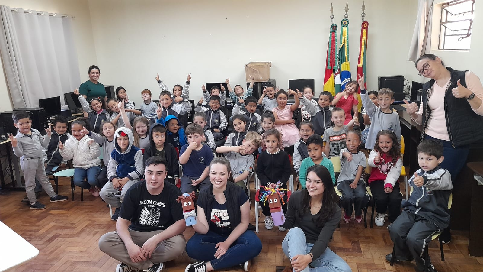 Na tarde de hoje, os acadêmicos de Licenciatura em Ciências Biológicas do IFFar – Campus Santo Augusto, Danieli Bueno Schreiber, Guilherme Faustino Boelter e Thaís Luciane Morgenstern, apresentaram um teatro de fantoches e uma palestra com a temática “Lixo e Meio Ambiente”, para os alunos das séries iniciais da Escola Municipal Cívico Militar São João.