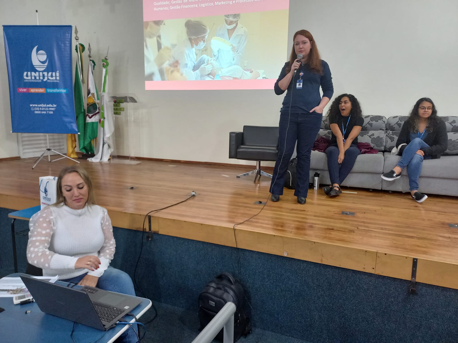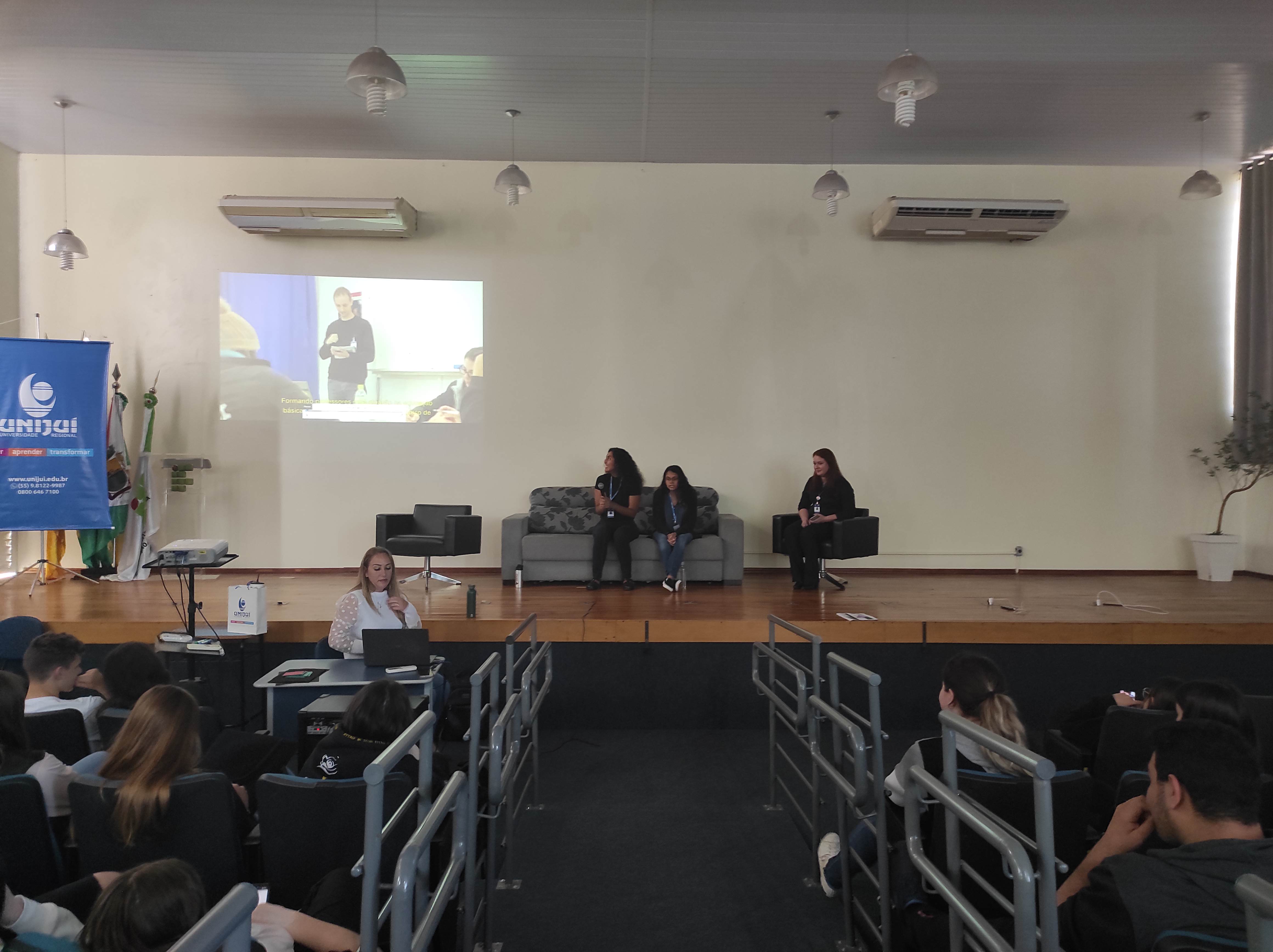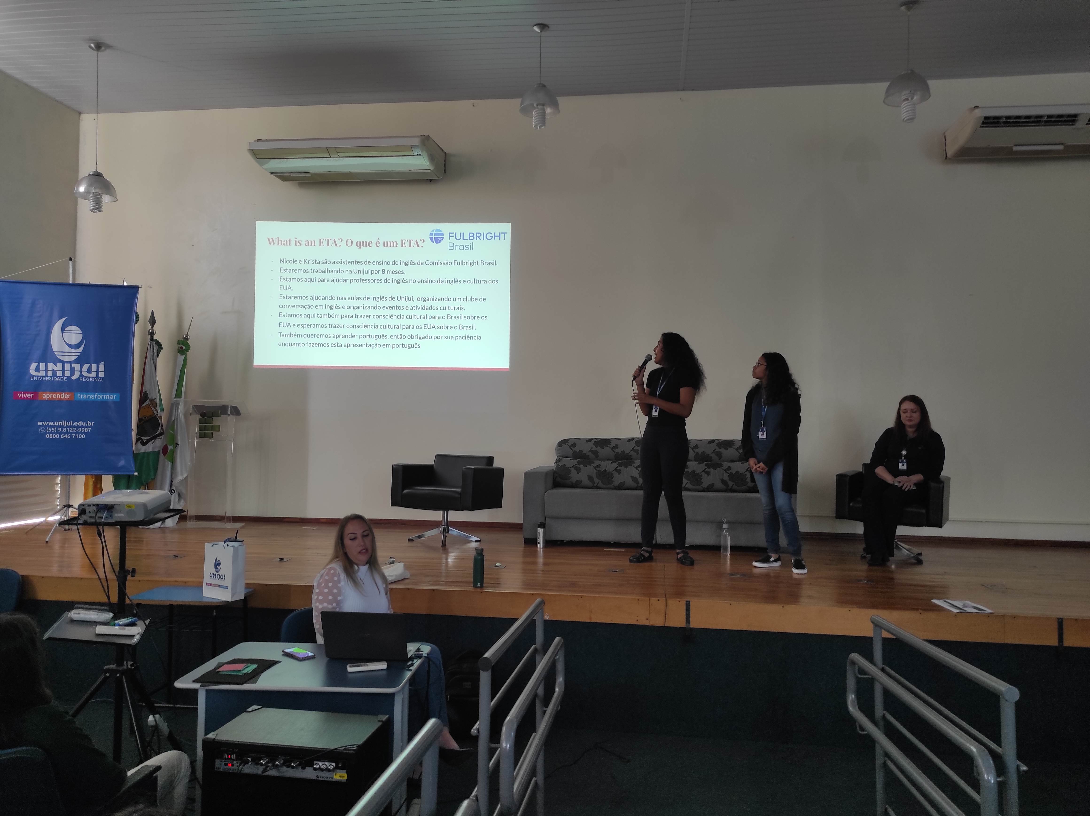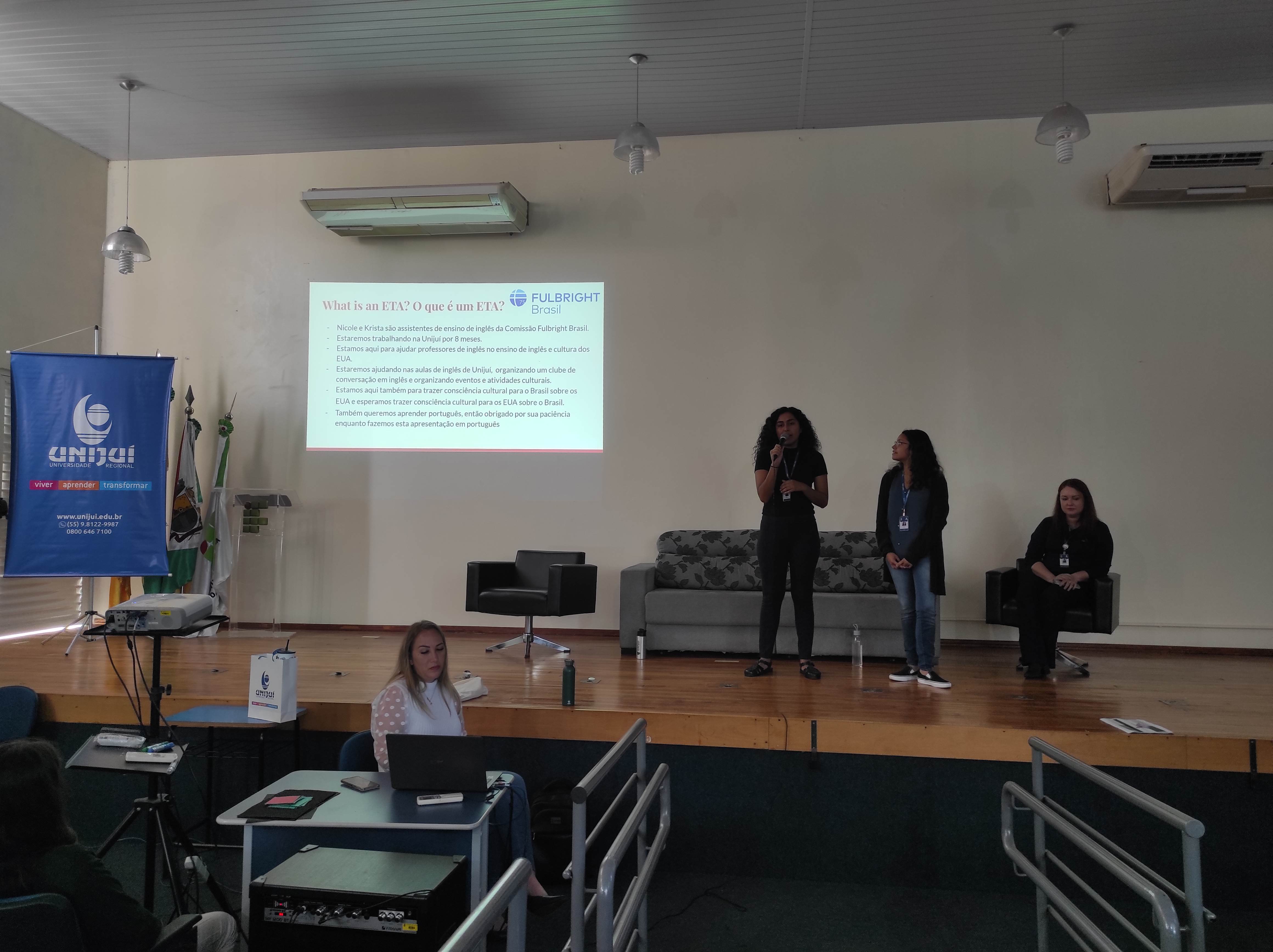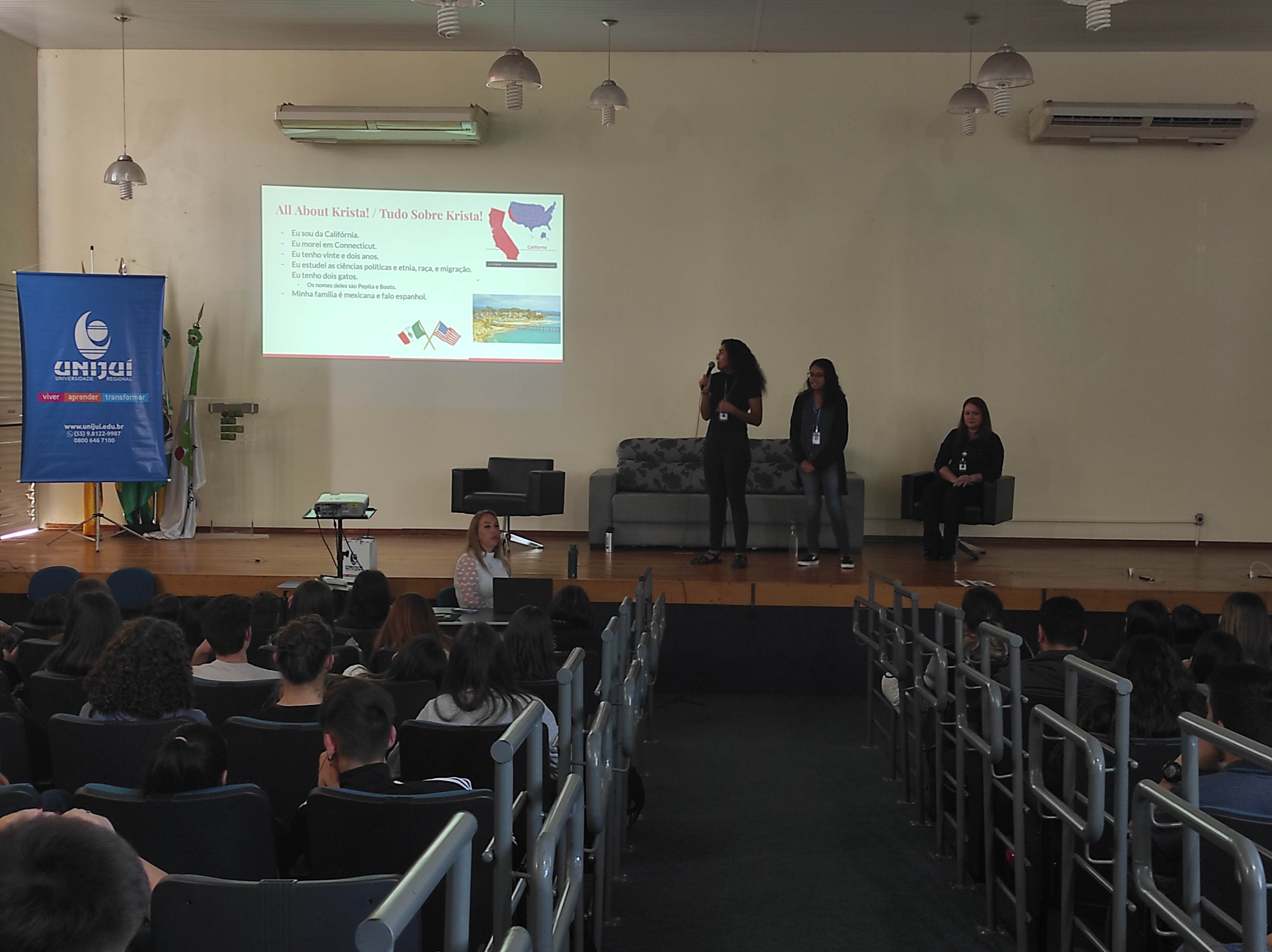 Nicole e Krista, durante a conversa com os estudantes, contaram de suas origens latinas, respectivamente mexicana e colombiana, que favoreceu o aprendizado do português, em virtude de falarem além do inglês, também o espanhol fluentemente. Ambas estão atuando na Unijuí como professoras de inglês, por meio de intercâmbio da Fulbright, com duração total de oito meses, encerrando no final de 2022.