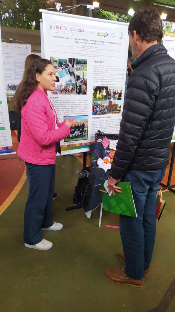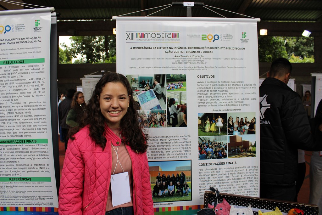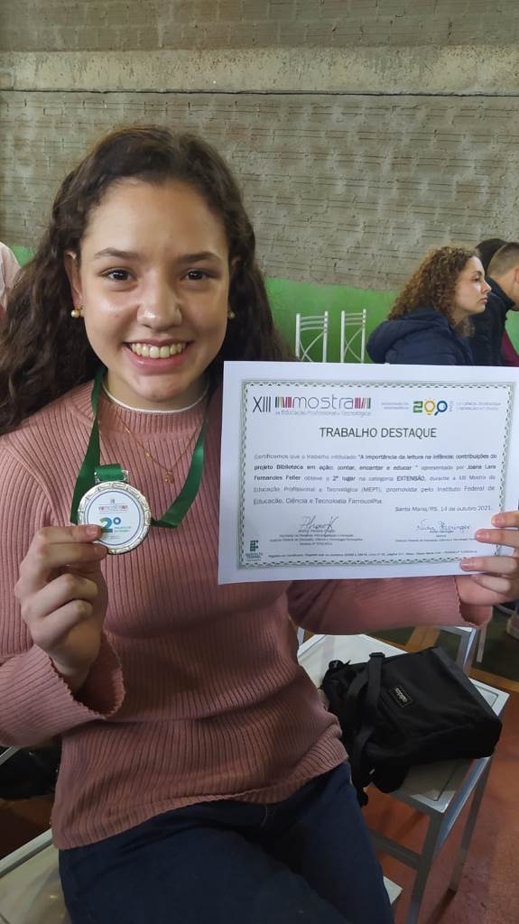 O Campus também foi premiado em 2º lugar na Categoria Extensão, com o trabalho “A importância da leitura na infância: contribuições do projeto Biblioteca em Ação”, apresentado pela estudante do 3º ano do curso técnico em Administração, Joana Lara Fernandes Feller, com a orientação da Bibliotecária, Daniela Cristina Paulo D'Acampora. O projeto Biblioteca em Ação: contar, encantar e educar promovido pela Biblioteca Mario Quintana, do IFFar – Campus Santo Augusto, visa incentivar a leitura através da mediação de histórias, promovendo a hora do conto para a comunidade escolar de Santo Augusto e região desde 2011, sempre modificando e se reestruturando, com o foco no incentivo à leitura. Pela observação dos aspectos analisados ao longo dos anos em que o projeto acontece, é possível identificar como positivo o modo através do qual as ações de educação não formal e dinamização comunitária são vistas pelos participantes, principalmente para os alunos adolescentes, que, além de se aproximarem da biblioteca do campus, também exercem papel importante na fase escolar das crianças da comunidade, pois estão ali, plantando uma semente, auxiliando no incentivo a novos leitores