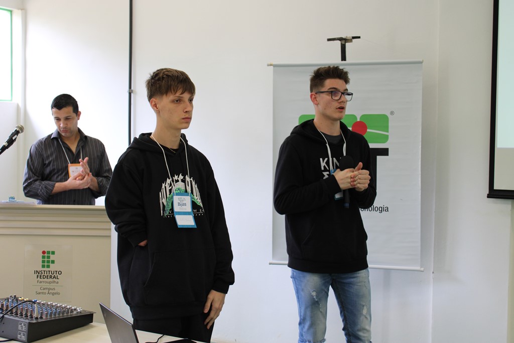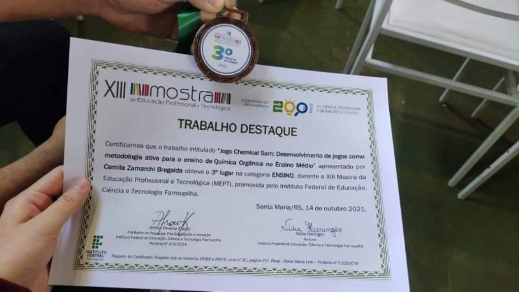 O Campus Santo Augusto foi premiado no evento em 3º lugar na Categoria Ensino pelo trabalho “Jogo Chemical Sam: Desenvolvimento de Jogos como Metodologia Ativa”, desenvolvido pelos estudantes do 3º ano do técnico em Informática, Camila Bregalda, Diego Breskovit Mocelli, Rafaela Gherke, Jonatan Hartmann e Davi Brasil Santos Mota, com a orientação dos professores Paulo Henrique de Oliveira e Pablo Nogara. As metodologias ativas consistem em colocar o aluno como autor de seu próprio processo de conhecimento, permitindo assim o desenvolvimento das habilidades do próprio aluno enquanto incentivam-no a melhorar suas habilidades por si mesmo, tornando-o independente e capacitado. O trabalho apresenta o desenvolvimento de um jogo educativo on-line, que introduz uma abordagem diferente dos métodos tradicionais, buscando uma compreensão mais efetiva dos estudantes, para os conteúdos relacionados à química orgânica.