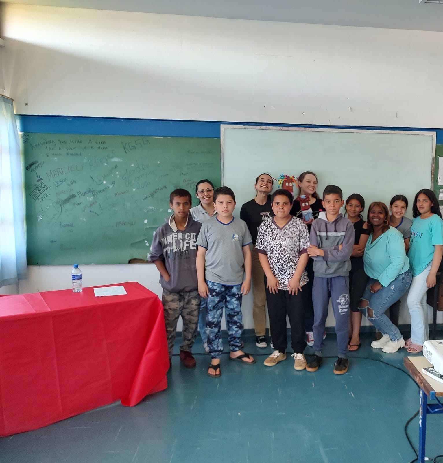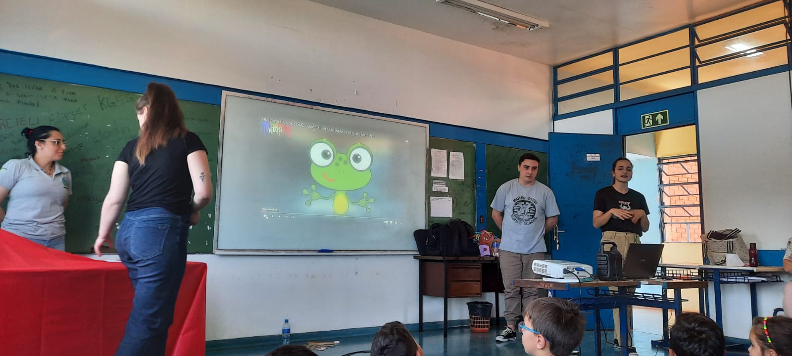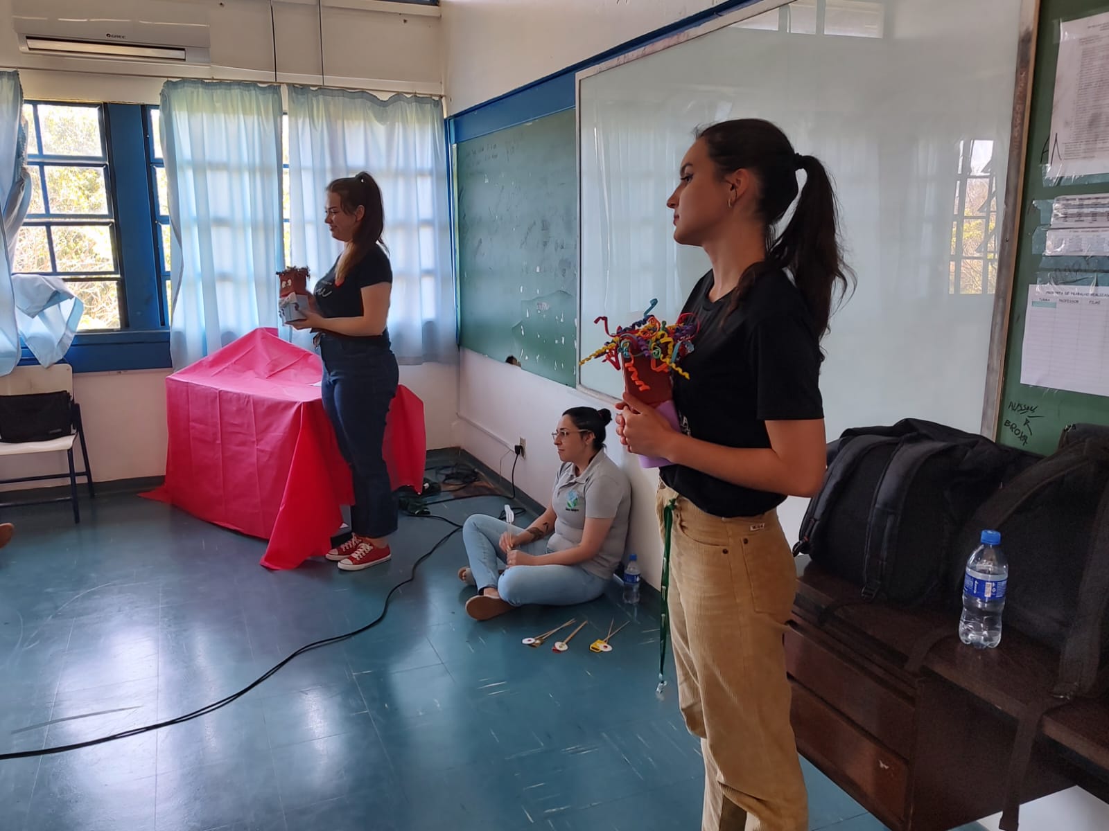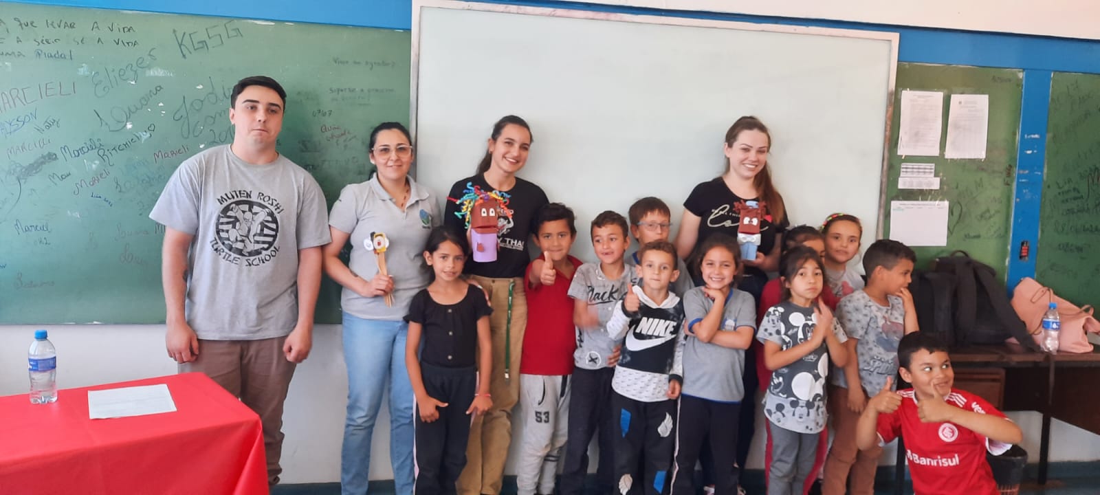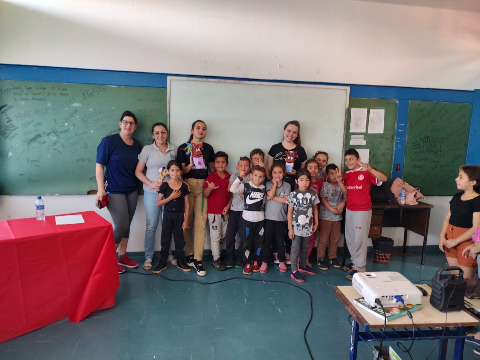 Os acadêmicos de Licenciatura em Ciências Biológicas do IFFar – Campus Santo Augusto, Andressa Maiara de Almeida Machado, Danieli Bueno Schreiber, Guilherme Faustino Boelter e Thaís Luciane Morgenstern, apresentaram no dia 27 de outubro, na Escola Estadual de Ensino Médio Senador Alberto Pasqualini – CIEP, para os estudantes do 1º a 9º ano do ensino fundamental, um teatro de fantoches e uma palestra com a temática “Lixo e Meio Ambiente”.