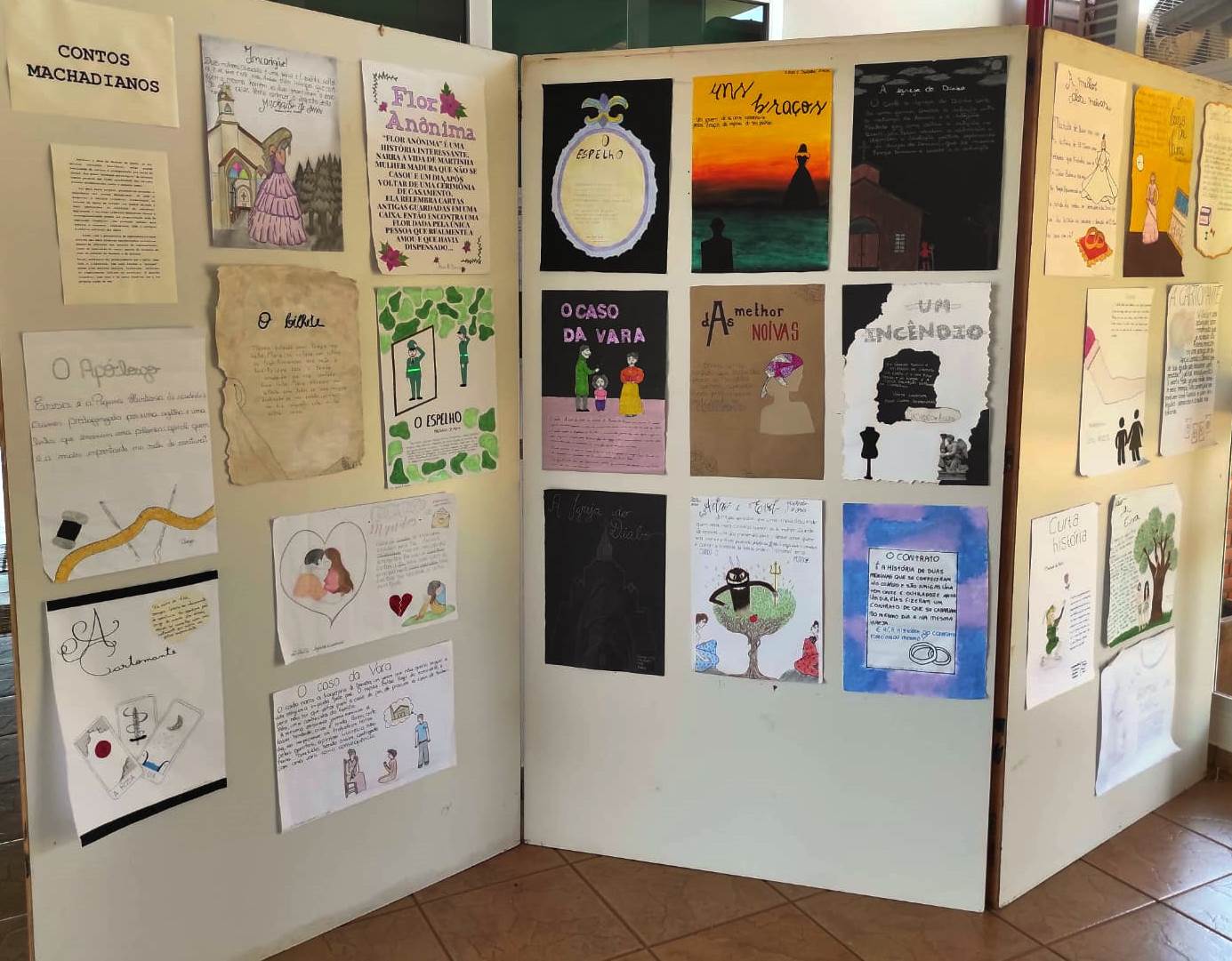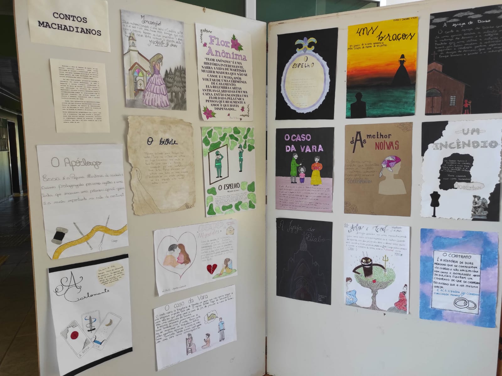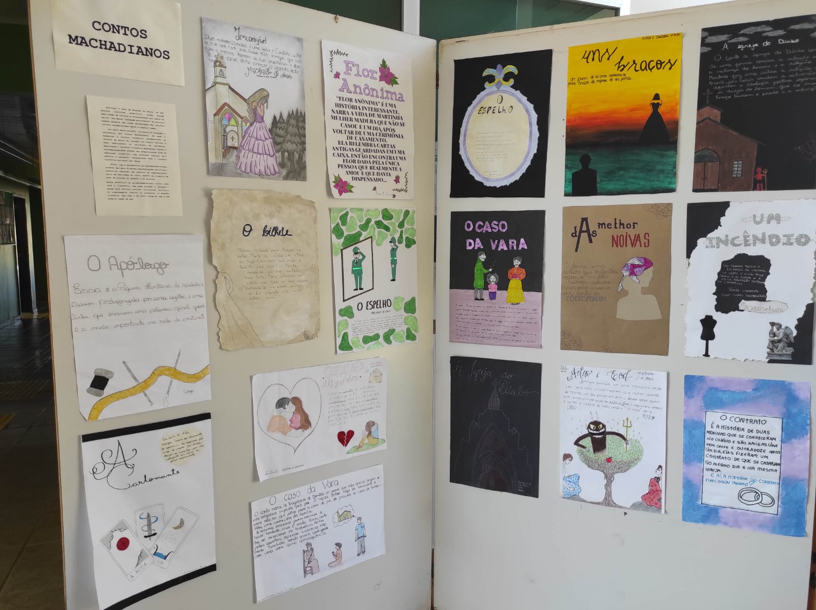 Os professores Edevandro de Sabino da Silva e Soni Pacheco de Moura desenvolveram com as turmas do 2º ano dos cursos técnicos integrados ao ensino médio de Alimentos, Administração e Agropecuária na disciplina, de Língua Portuguesa e Literatura Brasileira, uma atividade que resultou na construção de um painel de sinopses ilustradas, exposto para visitação no hall de entrada do IFFar – Campus Santo Augusto.