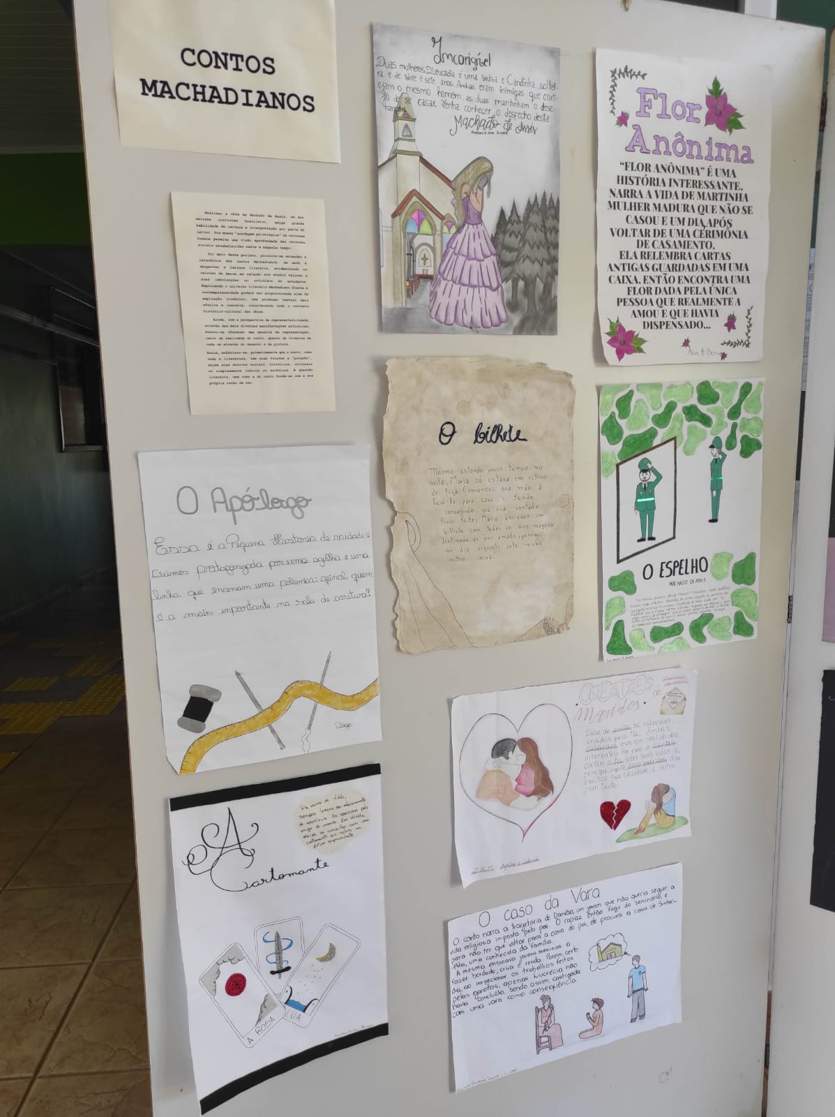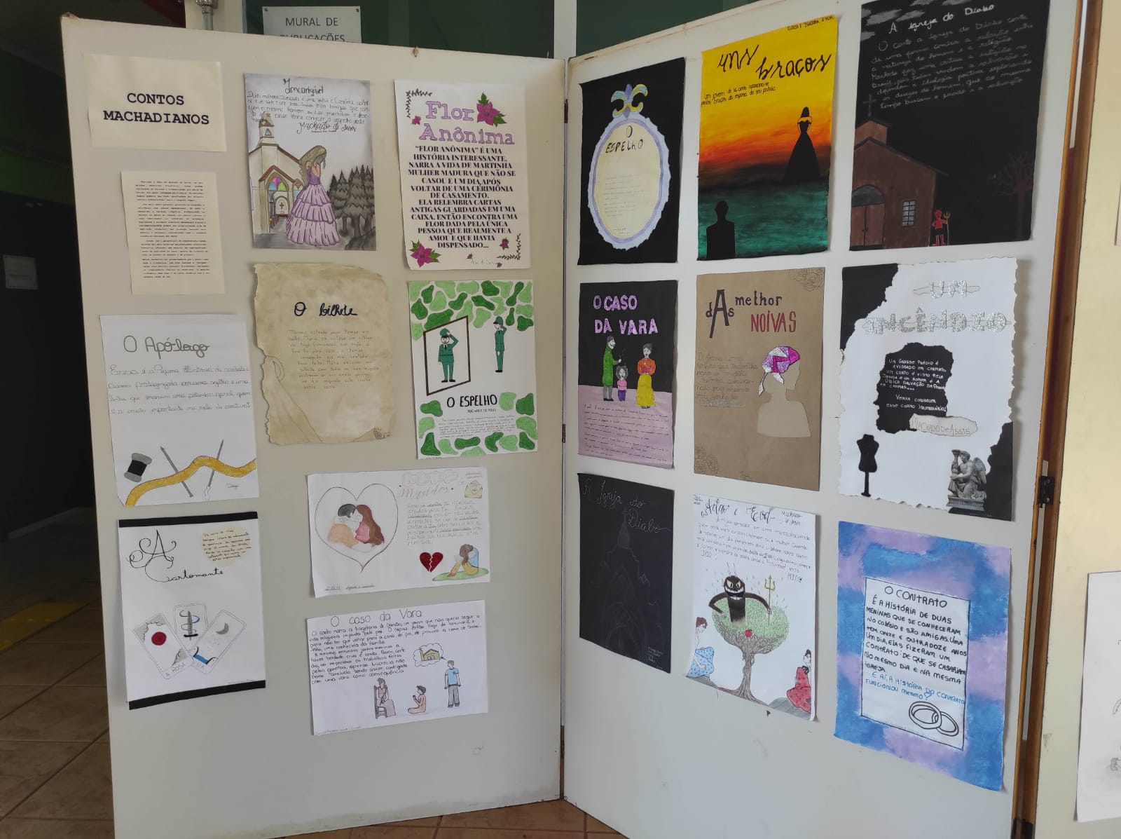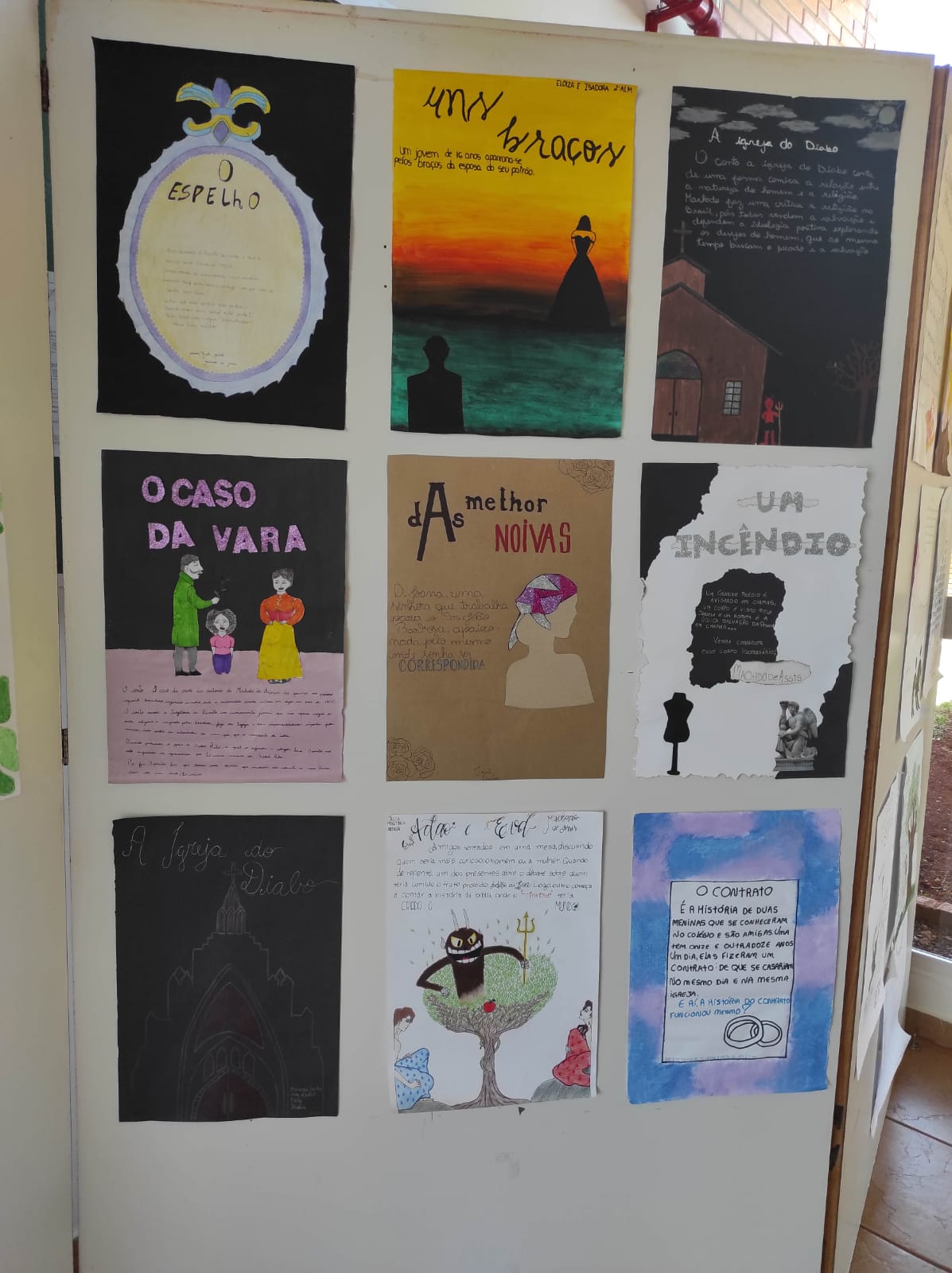 Os professores Edevandro de Sabino da Silva e Soni Pacheco de Moura desenvolveram com as turmas do 2º ano dos cursos técnicos integrados ao ensino médio de Alimentos, Administração e Agropecuária na disciplina, de Língua Portuguesa e Literatura Brasileira, uma atividade que resultou na construção de um painel de sinopses ilustradas, exposto para visitação no hall de entrada do IFFar – Campus Santo Augusto.