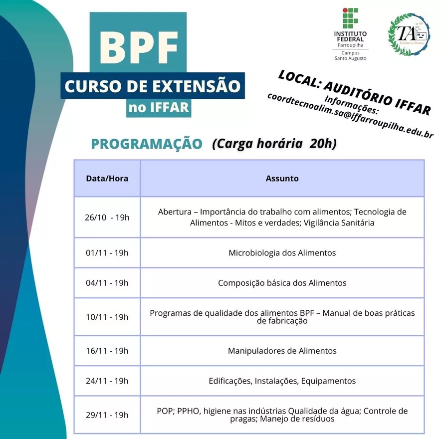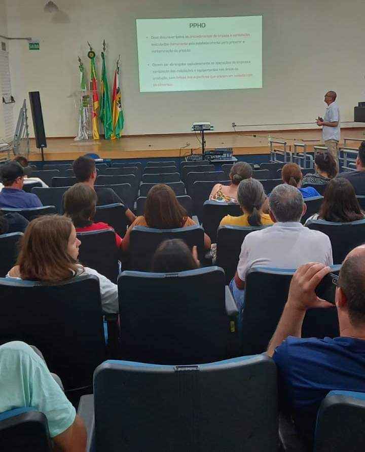 Foi realizado no dia 29 de novembro, às 19h, no auditório do IFFar - Campus Santo Augusto, o encerramento do Curso de Extensão de Boas Práticas para Serviços de Alimentação, que abordou conhecimentos necessários para a manipulação correta dos alimentos, formação essencial para todas as pessoas que atuam ou desejam atuar com serviços de alimentação.