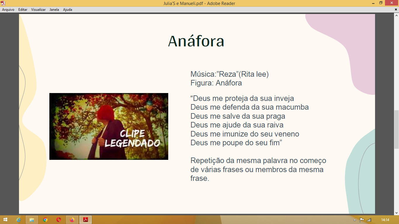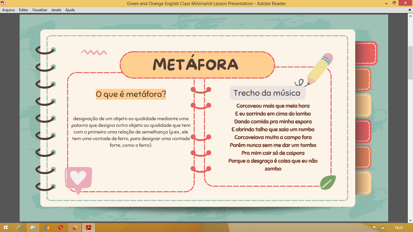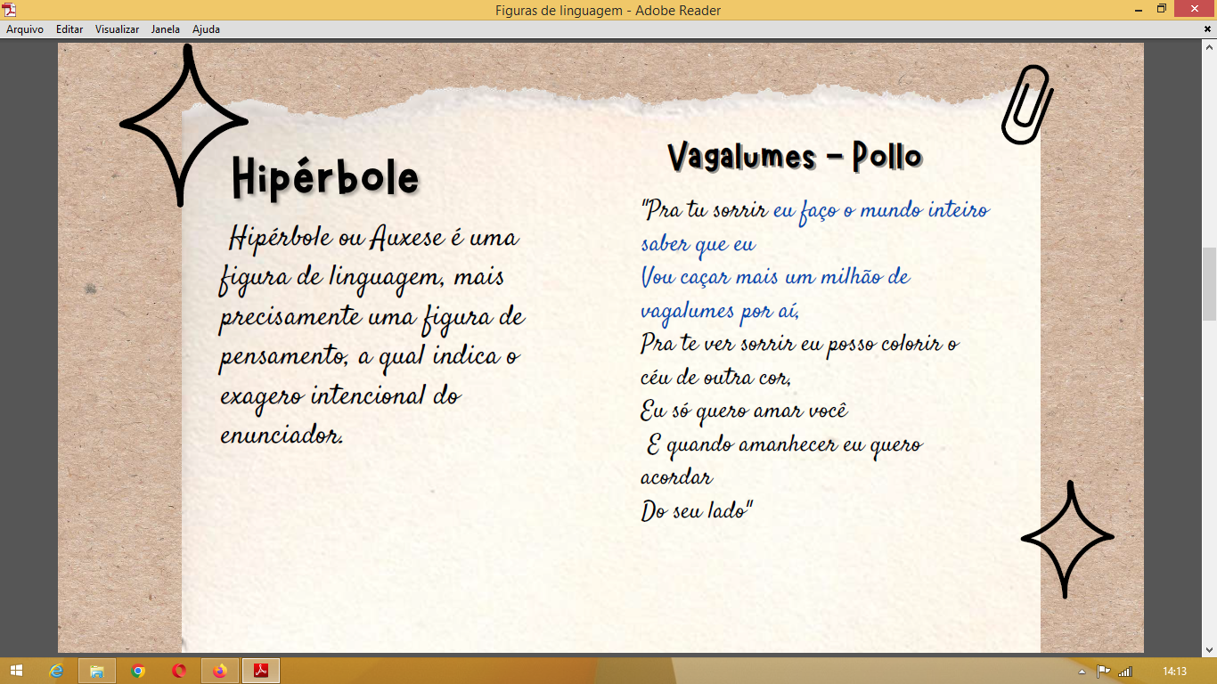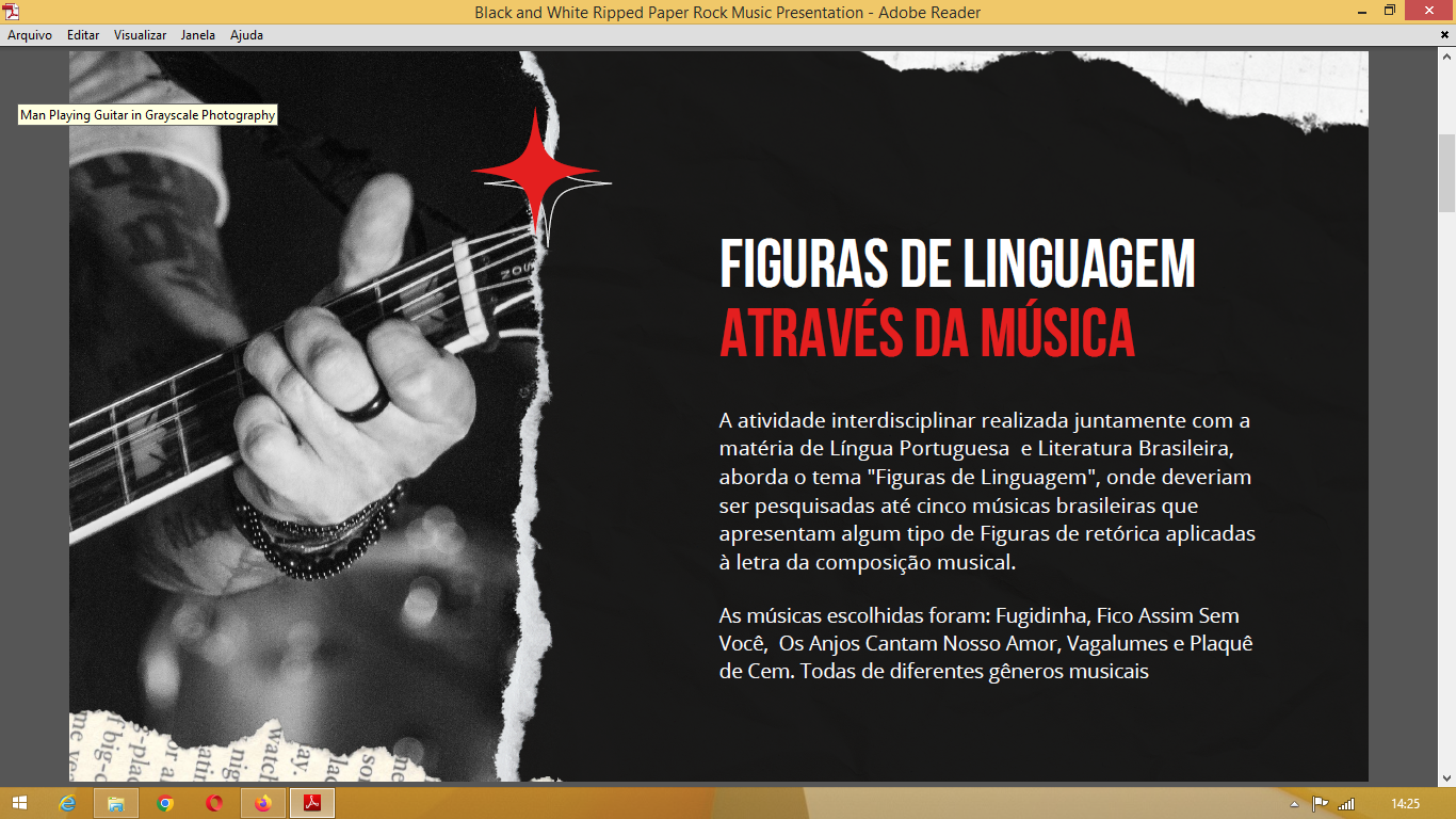 Divididos em duplas e trios os estudantes deveriam identificar cinco figuras de linguagem em letras de músicas nacionais e depois explicar o conceito de cada figura e exemplificar com o trecho da música. A atividade obteve uma boa aceitação das turmas, pois as músicas e as figuras de linguagem apresentadas foram escolhidas pelos estudantes, com a supervisão do professor.