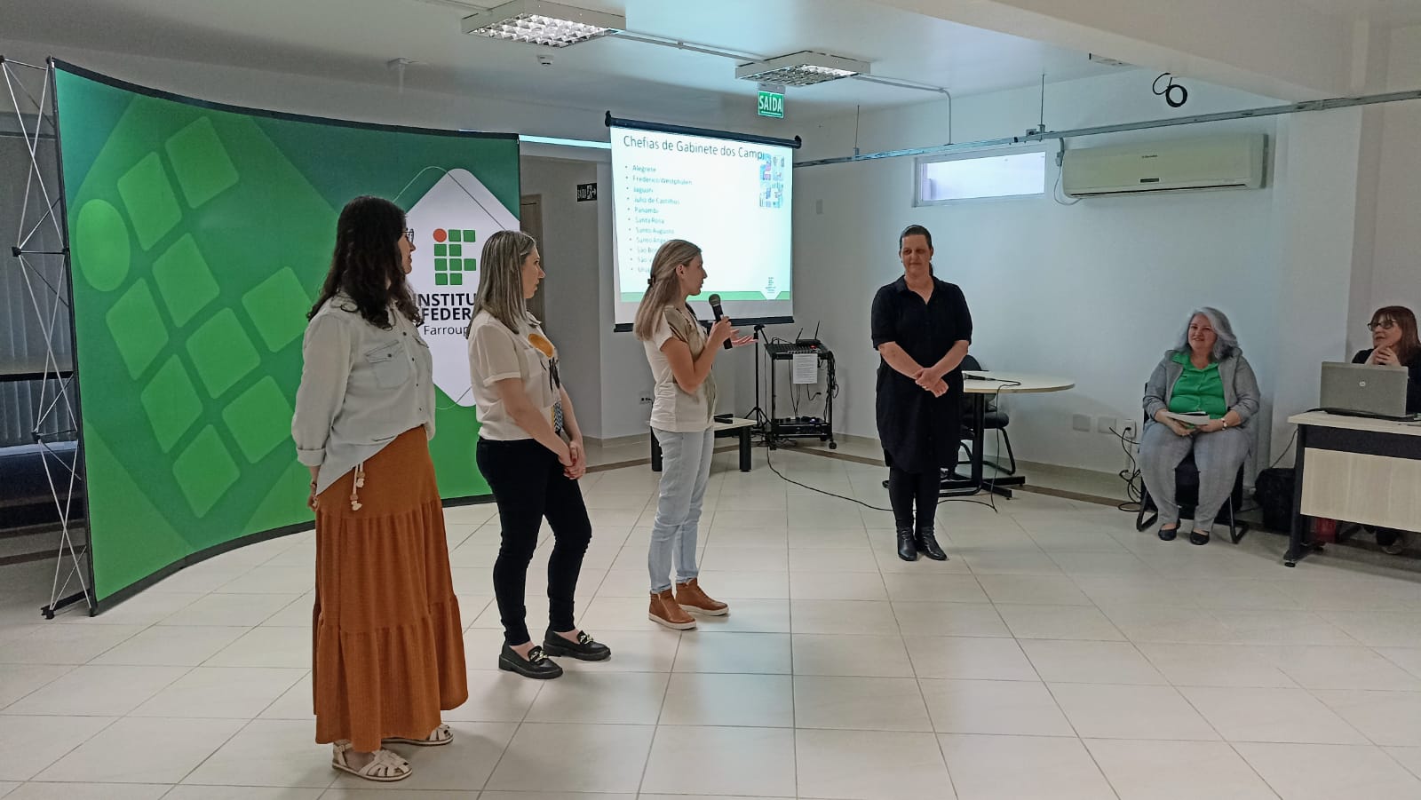 Nos dias 17 e 18 de agosto, a Equipe do Gabinete do Campus Santo Augusto participou do Encontro de Chefias de Gabinete e setores afins, na Reitoria do IFFar, em Santa Maria/RS. A Diretora de Ensino, Téoura Benetti representou a Direção do Campus no evento, juntamente com a Chefe de Gabinete, Deyse Lily Kuhn Claas, a Jornalista Carla Maron e a Chefe de Gabinete substituta, Tainara Machado Pinto.
