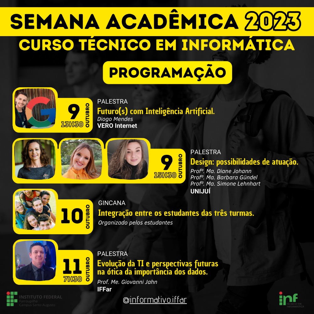 O evento iniciou na tarde de segunda-feira, dia 09, às 13h30, no auditório da instituição, com a palestra “Futuro(s) com inteligência artificial”, ministrada por Diego Mendes da Vero Internet, seguida pela palestra “Design: possibilidades de atuação”, ministrada pelas professoras da Unijui, Ma. Diane Johann, Ma. Barbara Gündel e Ma. Simone Lehnhardt. Na terça-feira, dia 10, aconteceram as provas da Gincana de integração. Na quarta-feira pela manhã aconteceu o encerramento do evento, com a palestra “Evolução da TI e perspectivas futuras na ótica da importância dos dados”, ministrada pelo servidor Me. Giovanni Jahn.