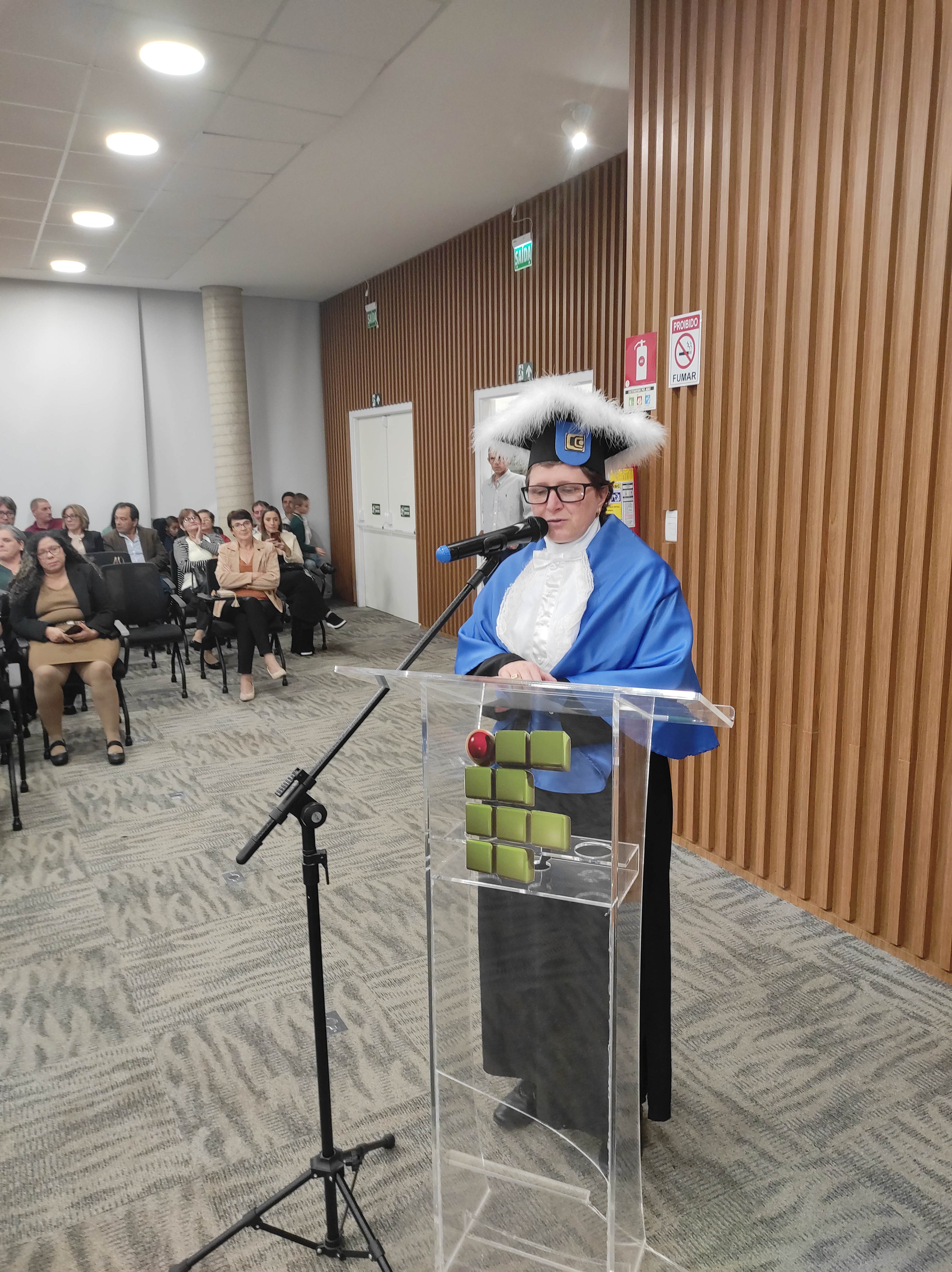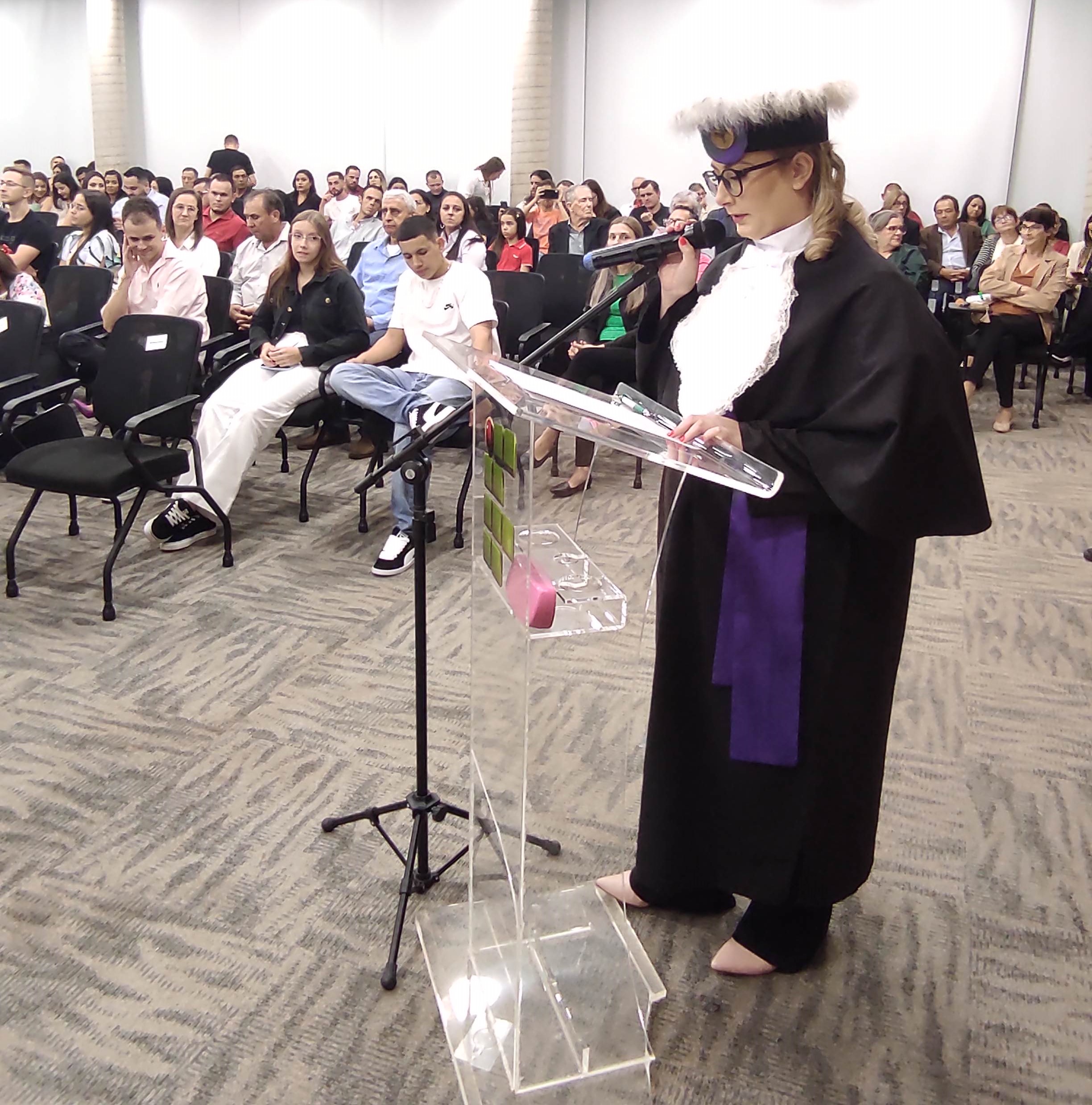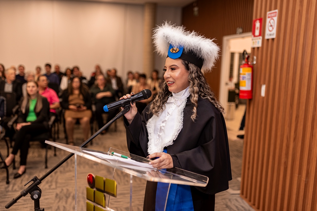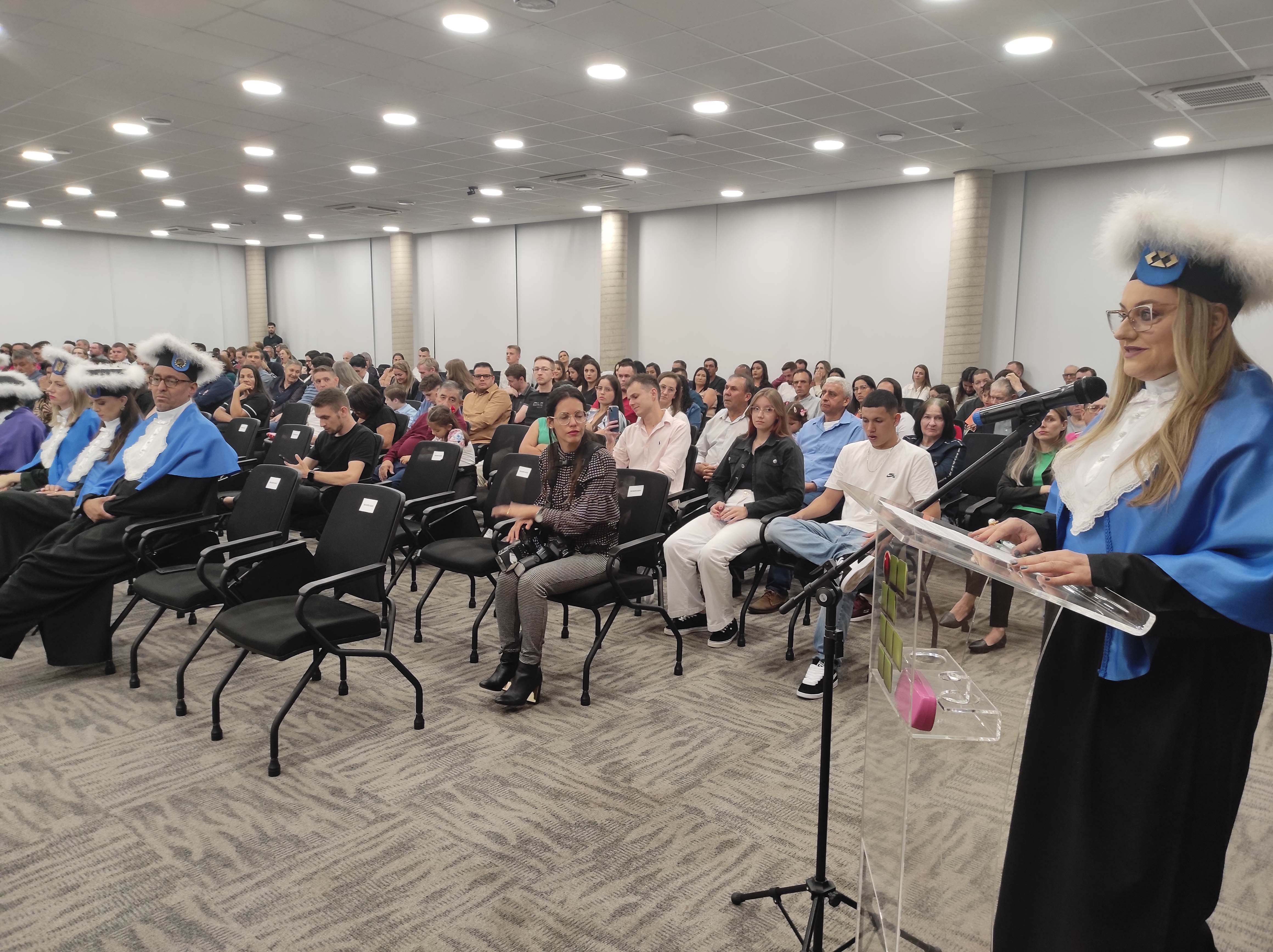 Em sua fala, a Diretora Márcia Fink, agradeceu ao Sicredi pela cedência do espaço e parabenizou os formandos pela conquista, destacando que o IFFar – Campus Santo Augusto há 16 anos tem buscado promover o Desenvolvimento Regional, dando acesso a cada vez mais pessoas a educação pública, gratuita e de qualidade, isso é reforçado a cada ano por meio das diversas turmas de formandos dos cursos superiores oferecidos pela instituição.