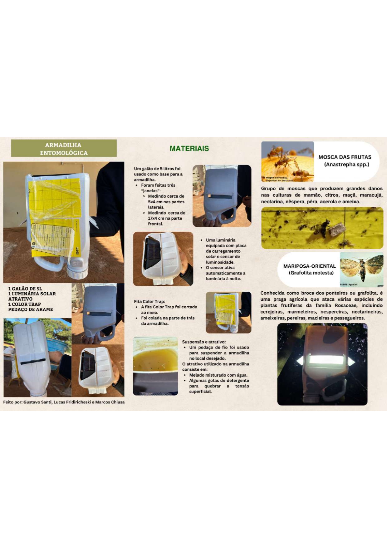 A turma do 5º semestre do curso superior de Bacharelado em Agronomia do IFFar –Campus Santo Augusto, finalizou o projeto de Prática Profissional Integrada (PPI) denominada “Construção de Sistema de Coleta de Pragas e Inimigos Naturais”, desenvolvida dentro das disciplinas de Entomologia (Rafael Bonadiman), Fruticultura (Ricardo Paraginski) e Agricultura de Base Ecológica(Tarcísio Samborski).