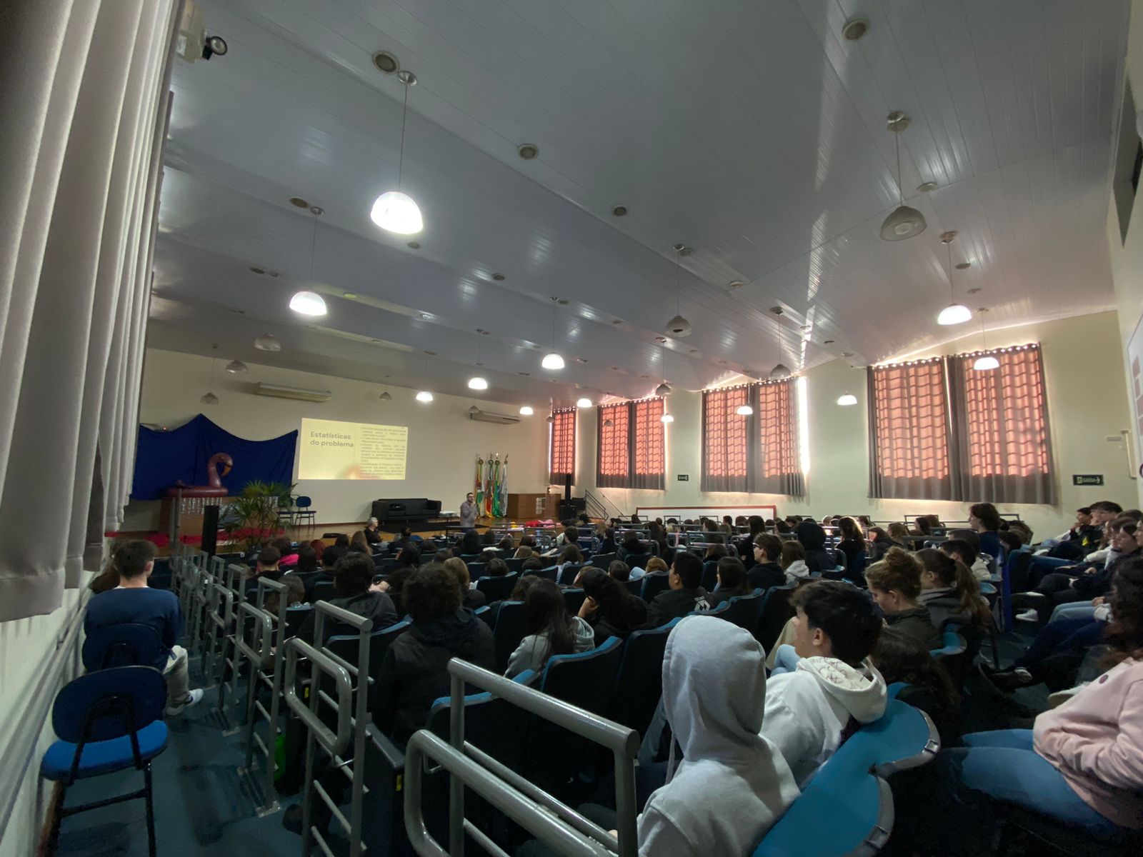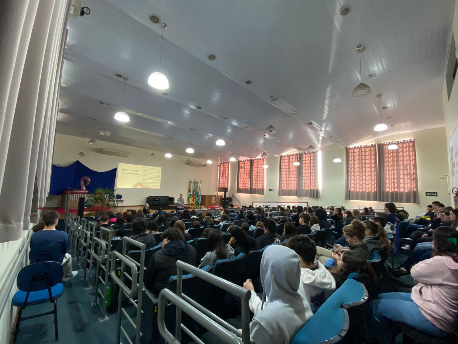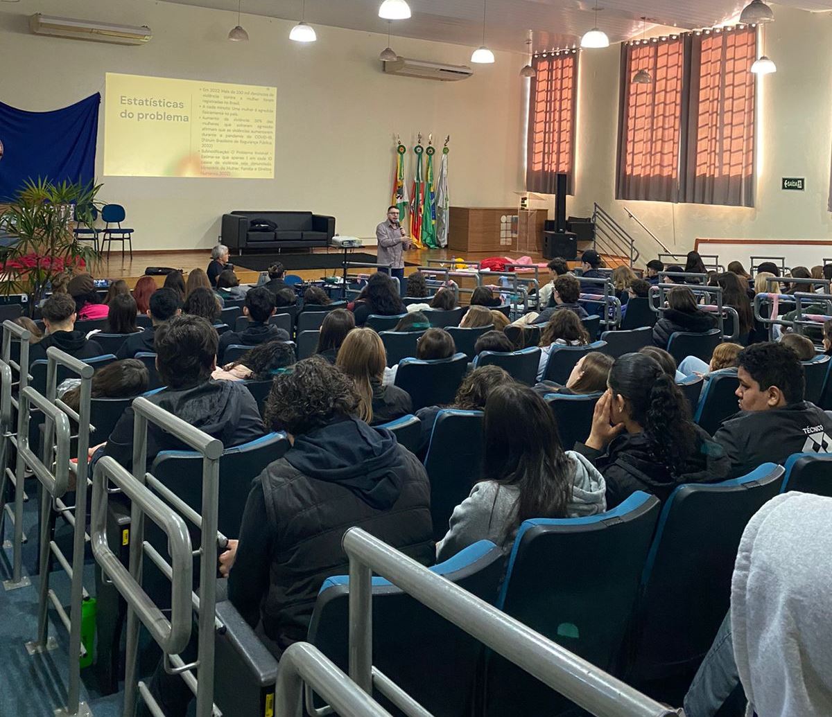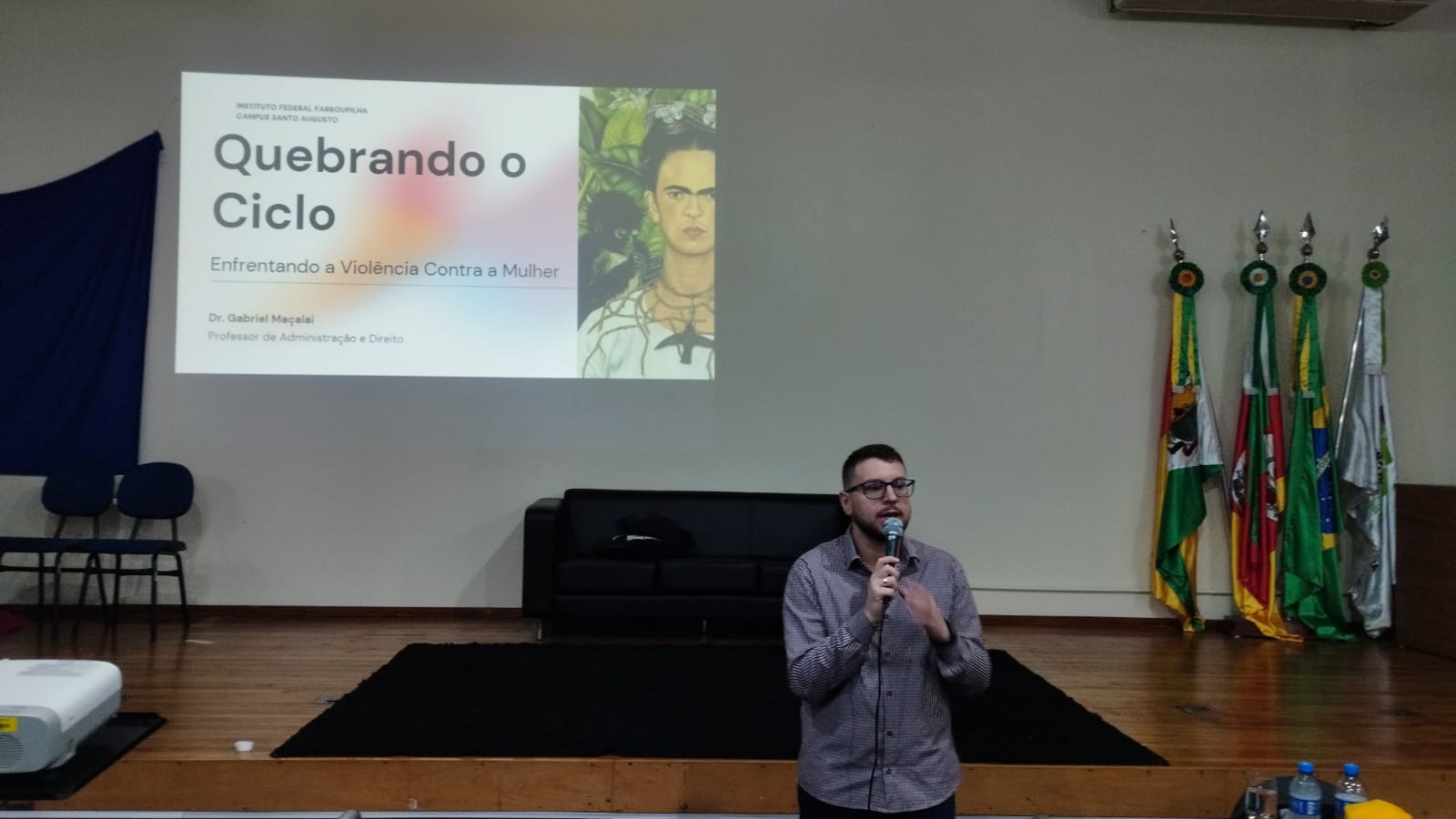 Os estudantes dos cursos técnicos integrados ao ensino médio participaram na parte da manhã no auditório da instituição de uma palestra, com o tema “Quebrando o Ciclo - Enfrentando a Violência Contra a Mulher”, ministrada pelo professor de Administração e Direito, Gabriel Maçalai, que falou sobre os tipos de violência e apresentou dados sobre a violência doméstica no Brasil.