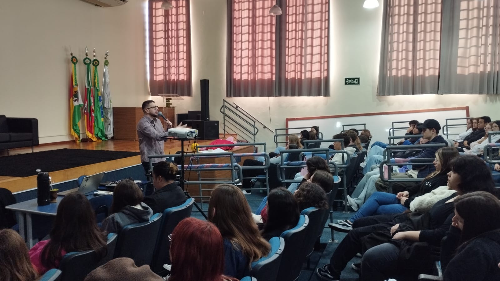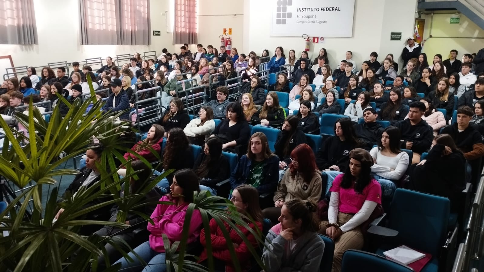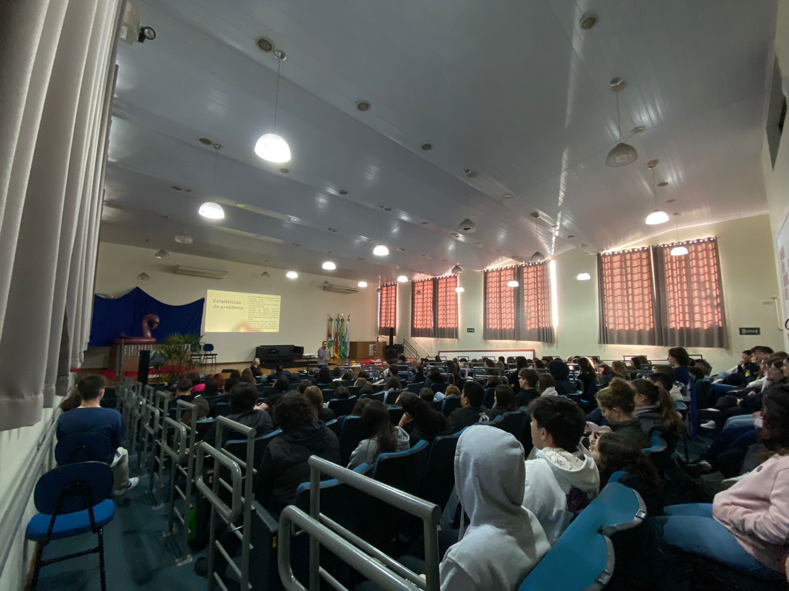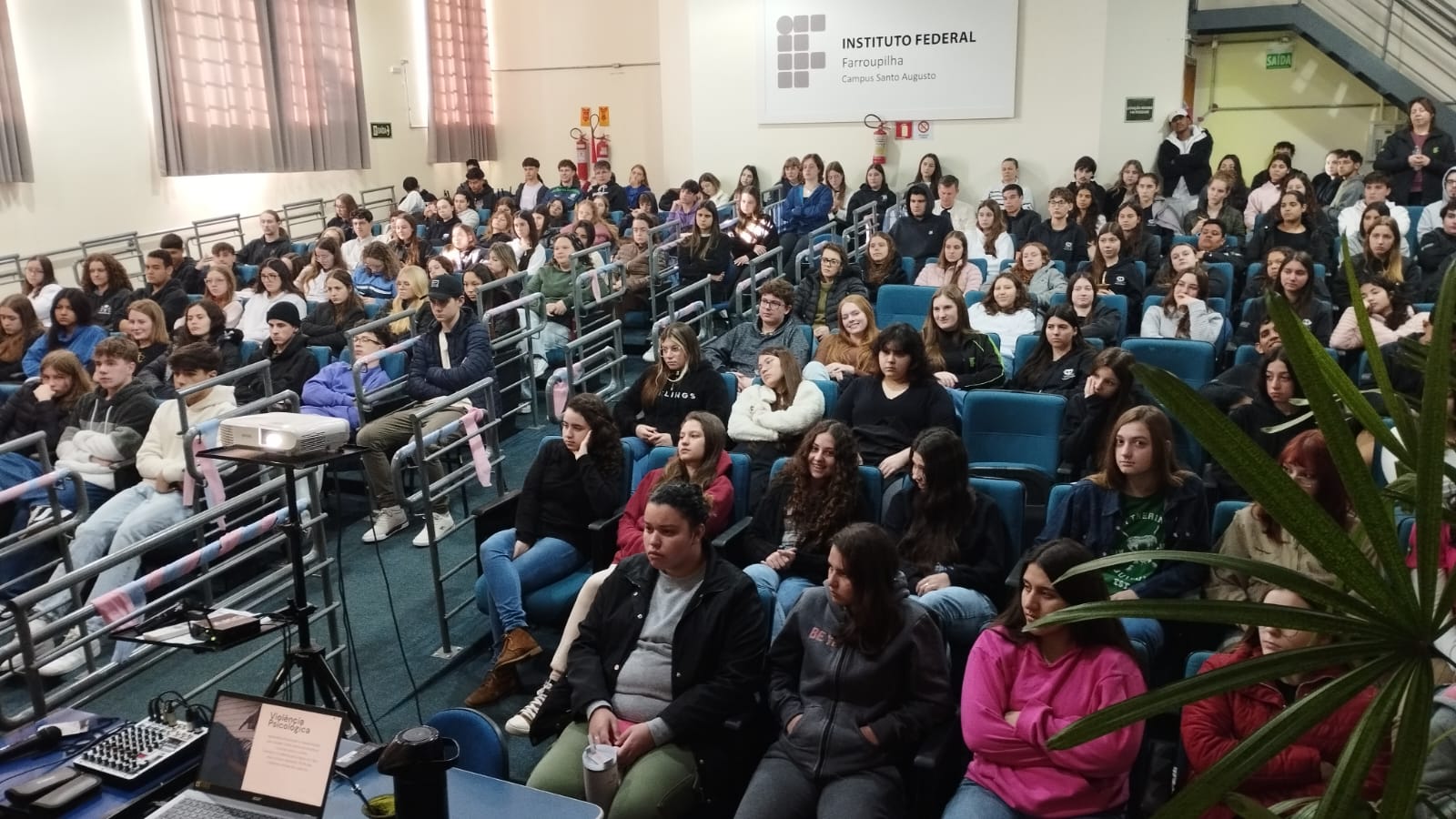 Os estudantes dos cursos técnicos integrados ao ensino médio participaram na parte da manhã no auditório da instituição de uma palestra, com o tema “Quebrando o Ciclo - Enfrentando a Violência Contra a Mulher”, ministrada pelo professor de Administração e Direito, Gabriel Maçalai, que falou sobre os tipos de violência e apresentou dados sobre a violência doméstica no Brasil.