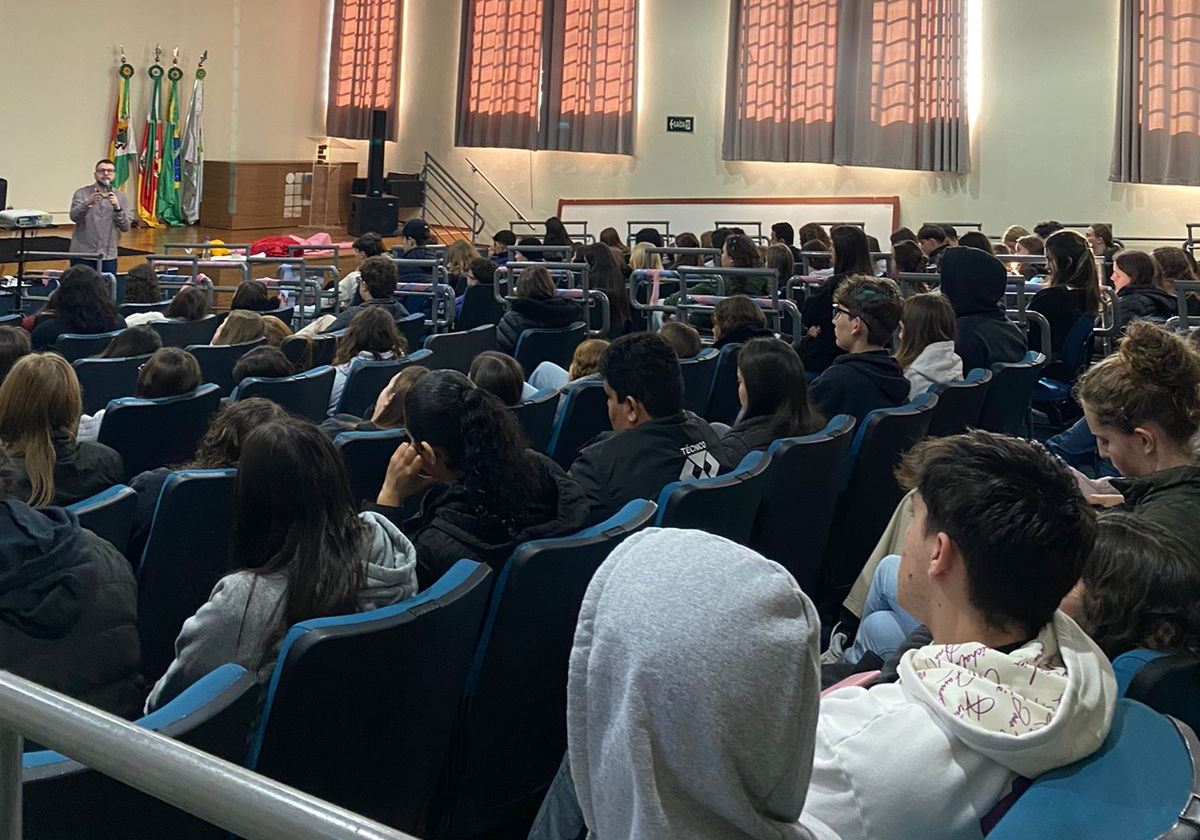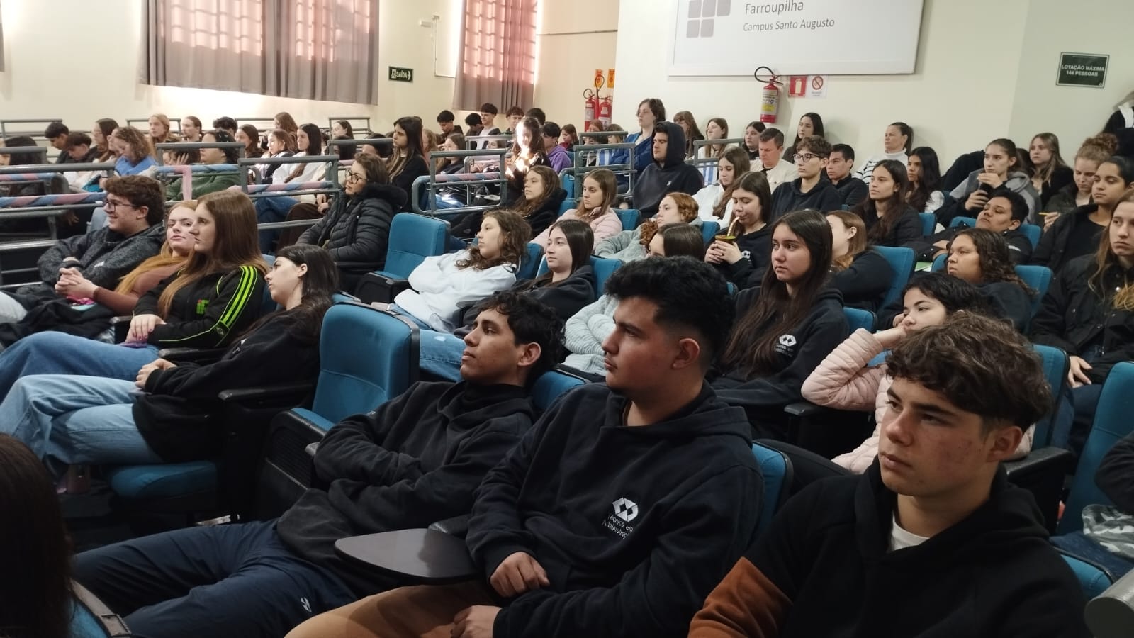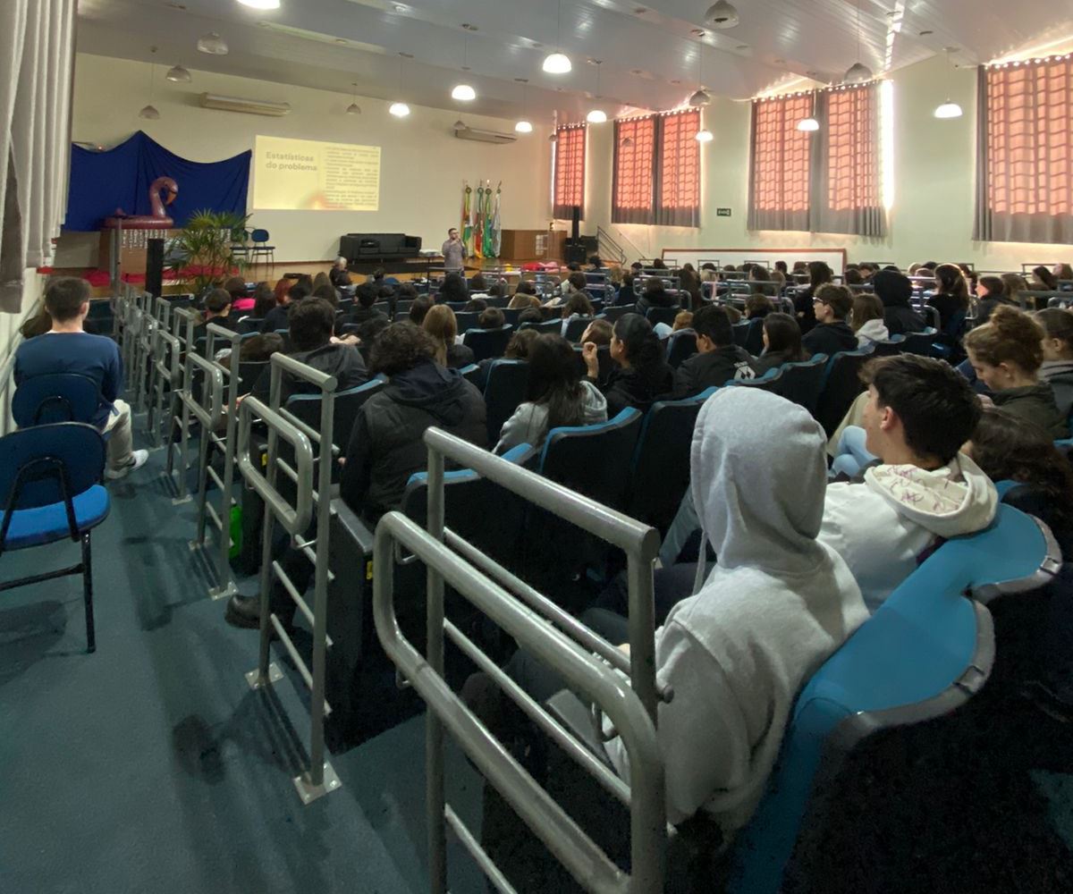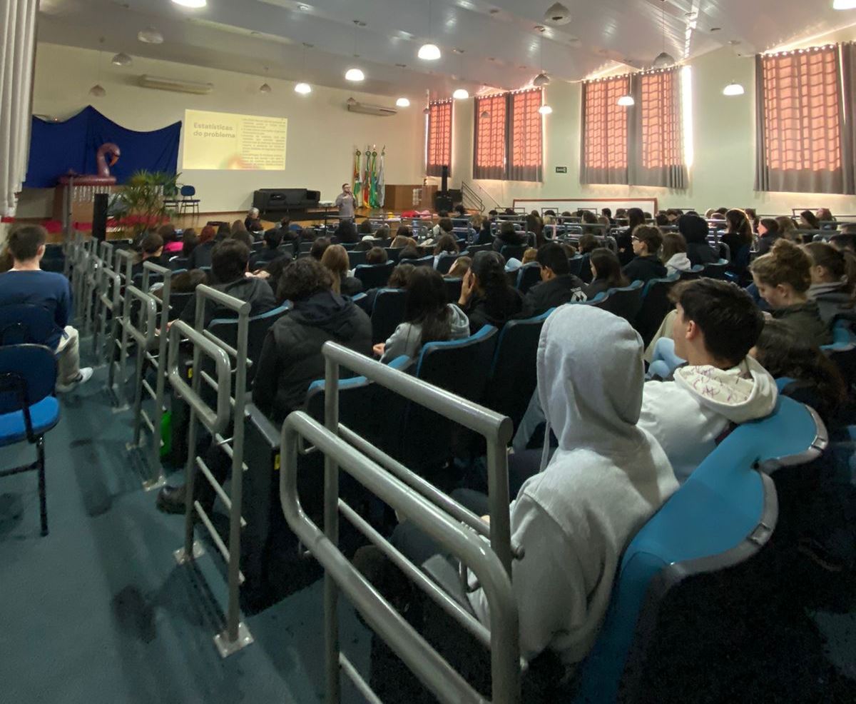 Os estudantes dos cursos técnicos integrados ao ensino médio participaram na parte da manhã no auditório da instituição de uma palestra, com o tema “Quebrando o Ciclo - Enfrentando a Violência Contra a Mulher”, ministrada pelo professor de Administração e Direito, Gabriel Maçalai, que falou sobre os tipos de violência e apresentou dados sobre a violência doméstica no Brasil.