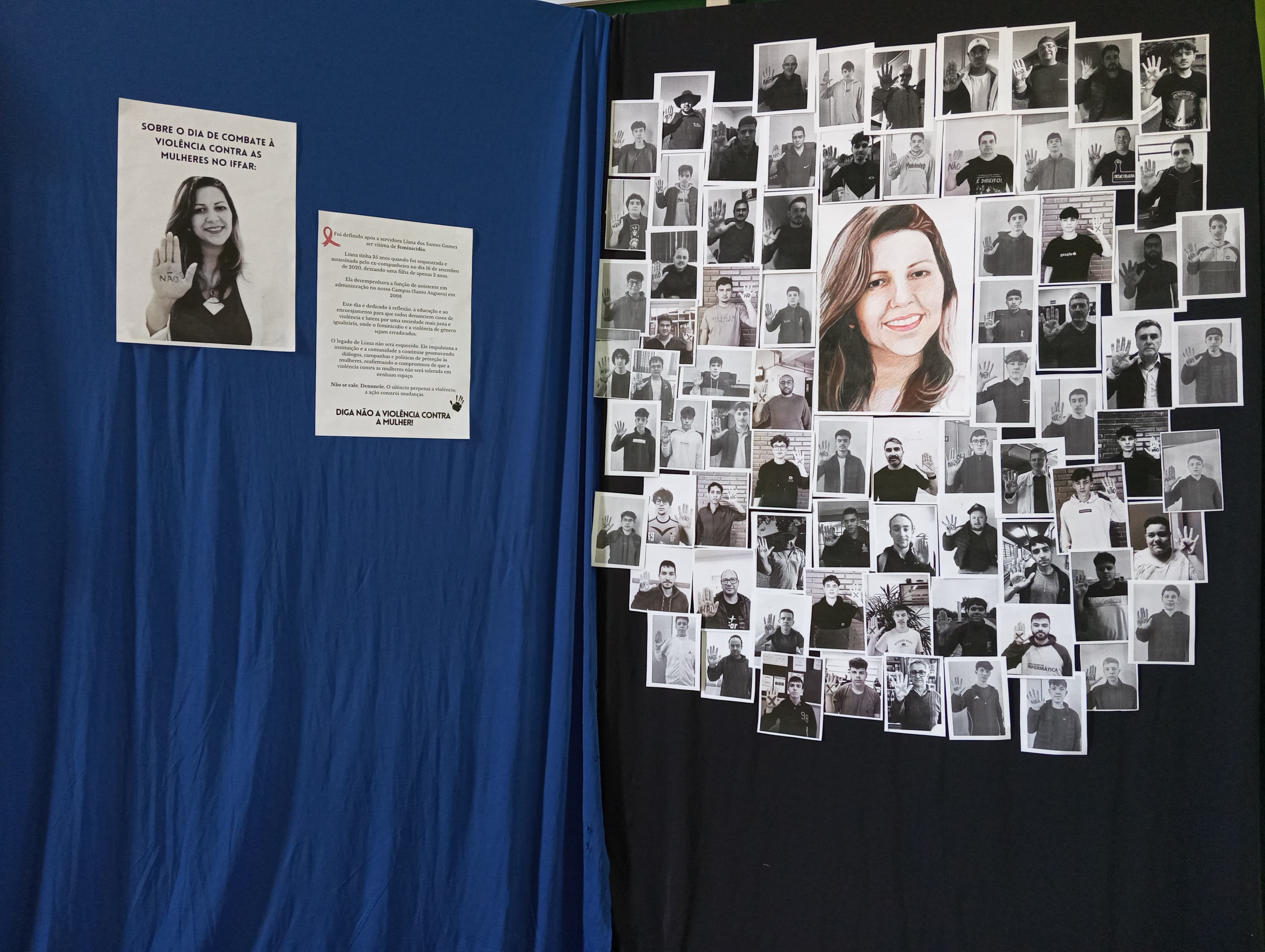 No hall do prédio F, foi organizado um painel em homenagem a servidora Liana Gomes, com fotos de estudantes e servidores homens da instituição, dizendo não à violência contra a mulher.