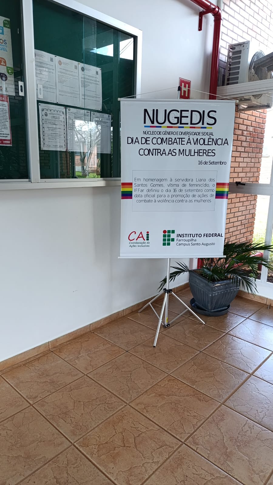 O Núcleo de Gênero e Diversidade Sexual do IFFar – Campus Santo Augusto – NUGEDIS, promoveu nesta segunda-feira, dia 16 de setembro, atividades ao Dia oficial de Combate à violência contra as mulheres no IFFar, institucionalizada após o feminicídio da servidora Liana dos Santos Gomes.