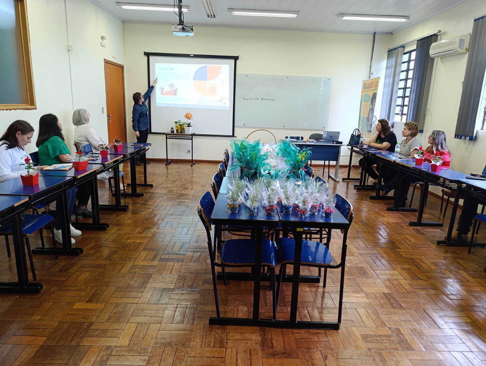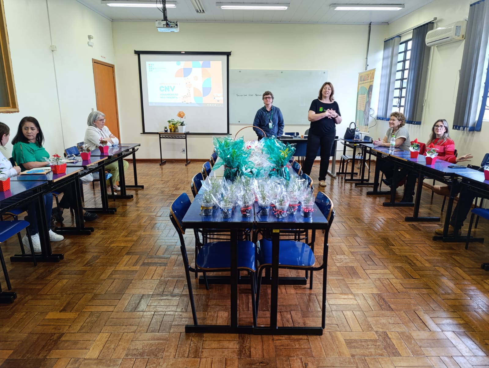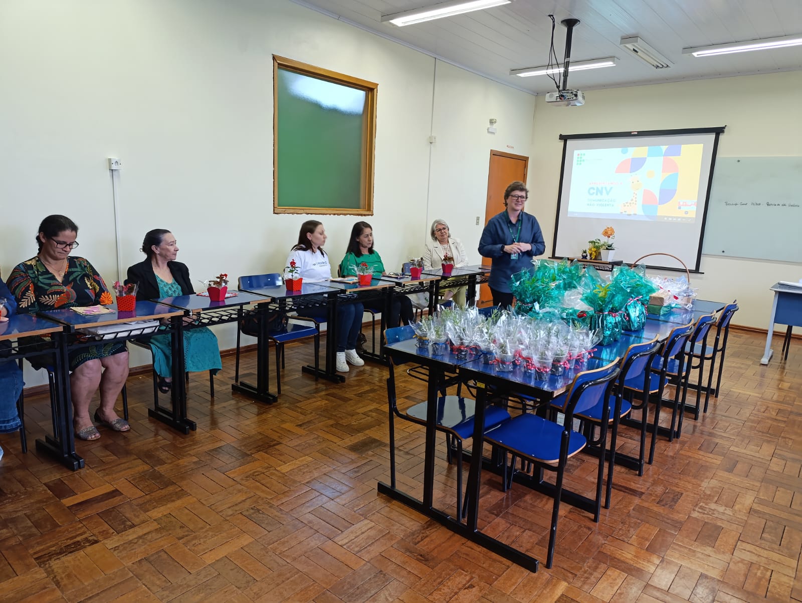 Na ocasião, a Diretora Márcia Fink fez uma fala sobre Comunicação não Violenta. Na sequência, as alunas do curso apresentaram os livros que criaram com suas histórias de vida, com relatos que emocionaram a todos os presentes, culminando com a entrega dos certificados e uma confraternização, tendo como cardápio, itens produzidos durante as últimas aulas do curso.