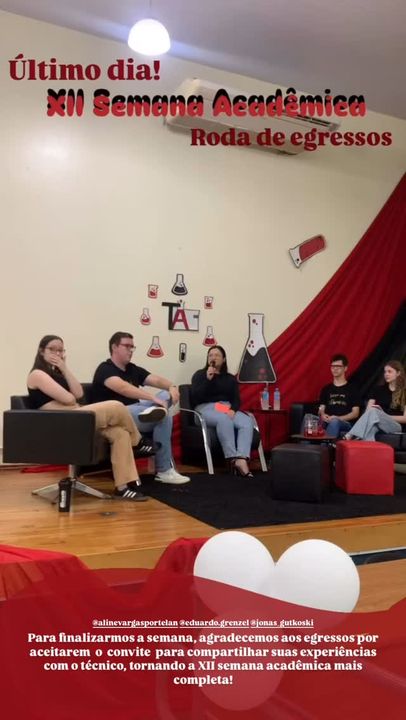 Na sexta-feira, dia 18, aconteceu a Roda de Conversa com os egressos, Aline Vargas Portelan, Eduardo Augusto Grenzel e Jonas Gutkoski da Silva, seguida por coffee break no laboratório de Leite e Derivados e depois divulgação dos vencedores da Gincana.