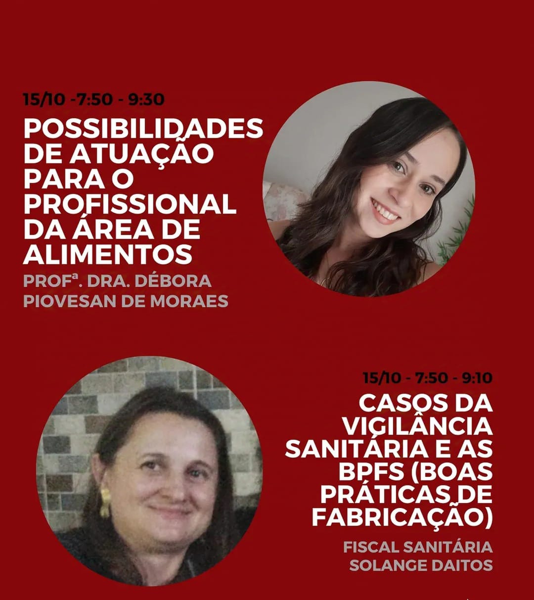 Na manhã de terça-feira, dia 15, aconteceram duas palestras por videoconferência: “Possibilidades de atuação para o profissional da área de alimentos”, com a professora Drª Débora Piovesan Moraes e “Casos da Vigilância Sanitária e as BPFs”, com a fiscal sanitária Solange Daitos. Na parte da tarde os alunos participaram de provas da Gincana de Integração.
