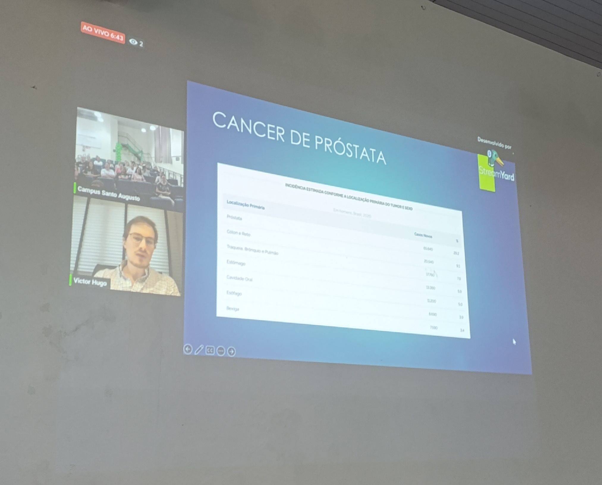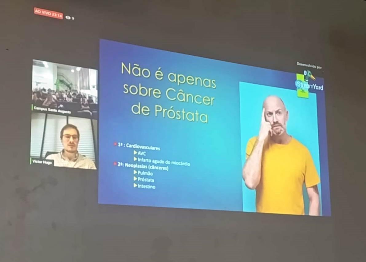 O evento teve início às 13h30, com a palestra online, com o médico Urologista, Victor Hugo Vione Schwengber, com a mediação do professor Dr. Tarcísio Samborski, trazendo dados sobre a incidência de câncer de próstata e intestino em homens maiores de 50 anos e a importância dos exames preventivos.