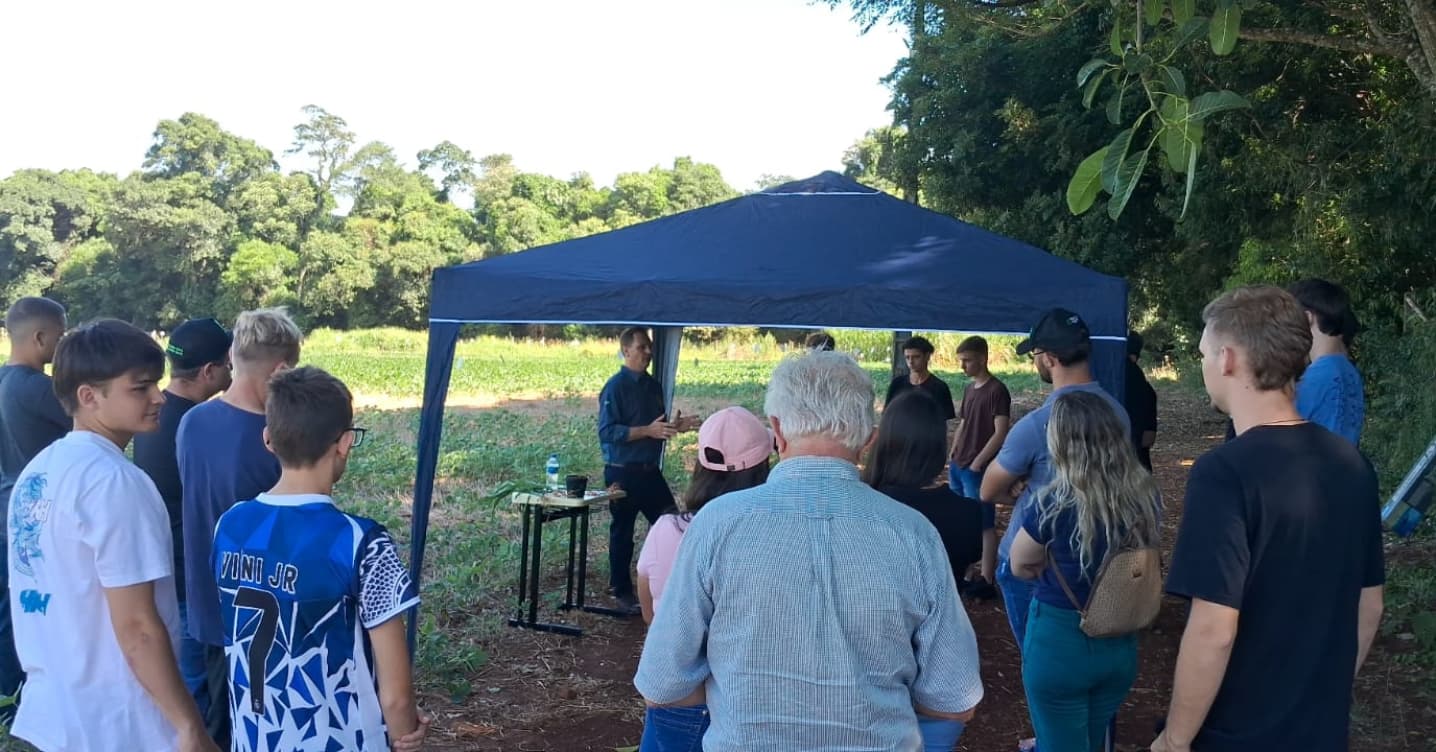 Após as palestras, os participantes foram visitar as sete estações montadas na área externa da instituição. As estações organizadas para visitação foram as seguintes: 1- Emater, 2 - KWS, 3 - Puro Trato, 4 - BMF, 5 - Botier, 6 - Bio Insumos e 7 - Experimento Densidade de Semeadura.