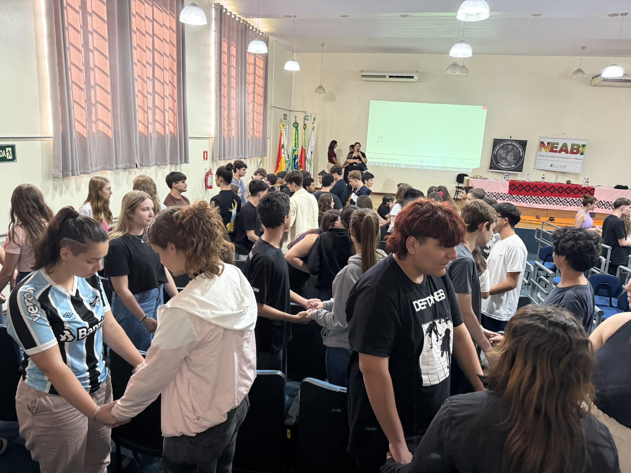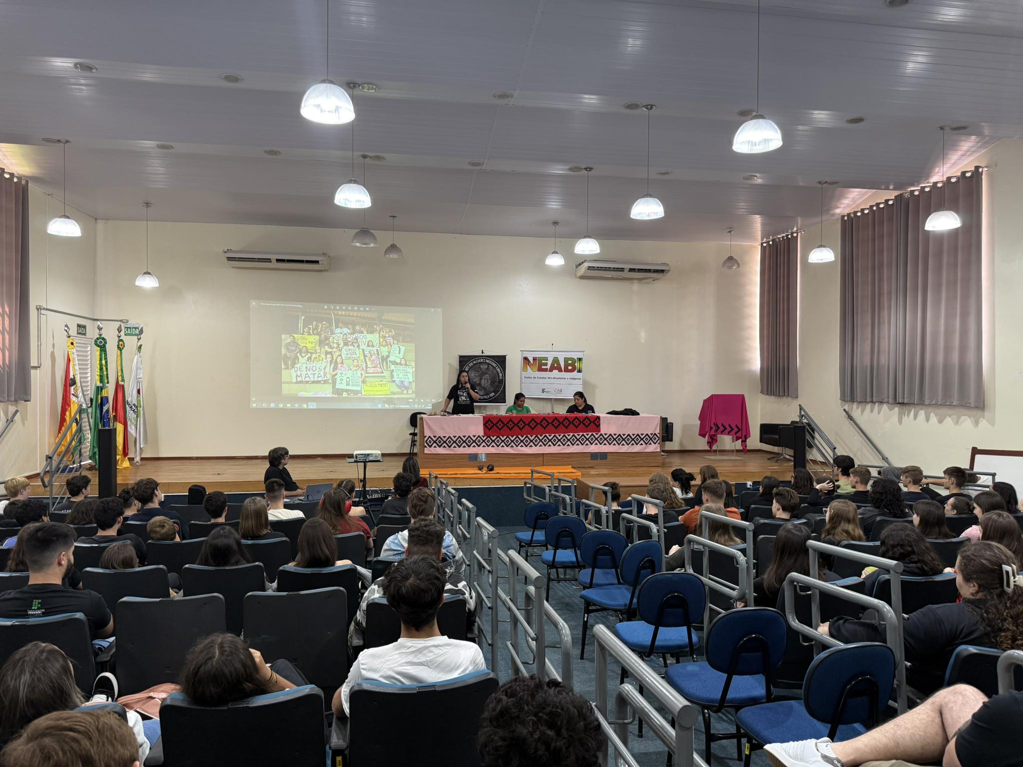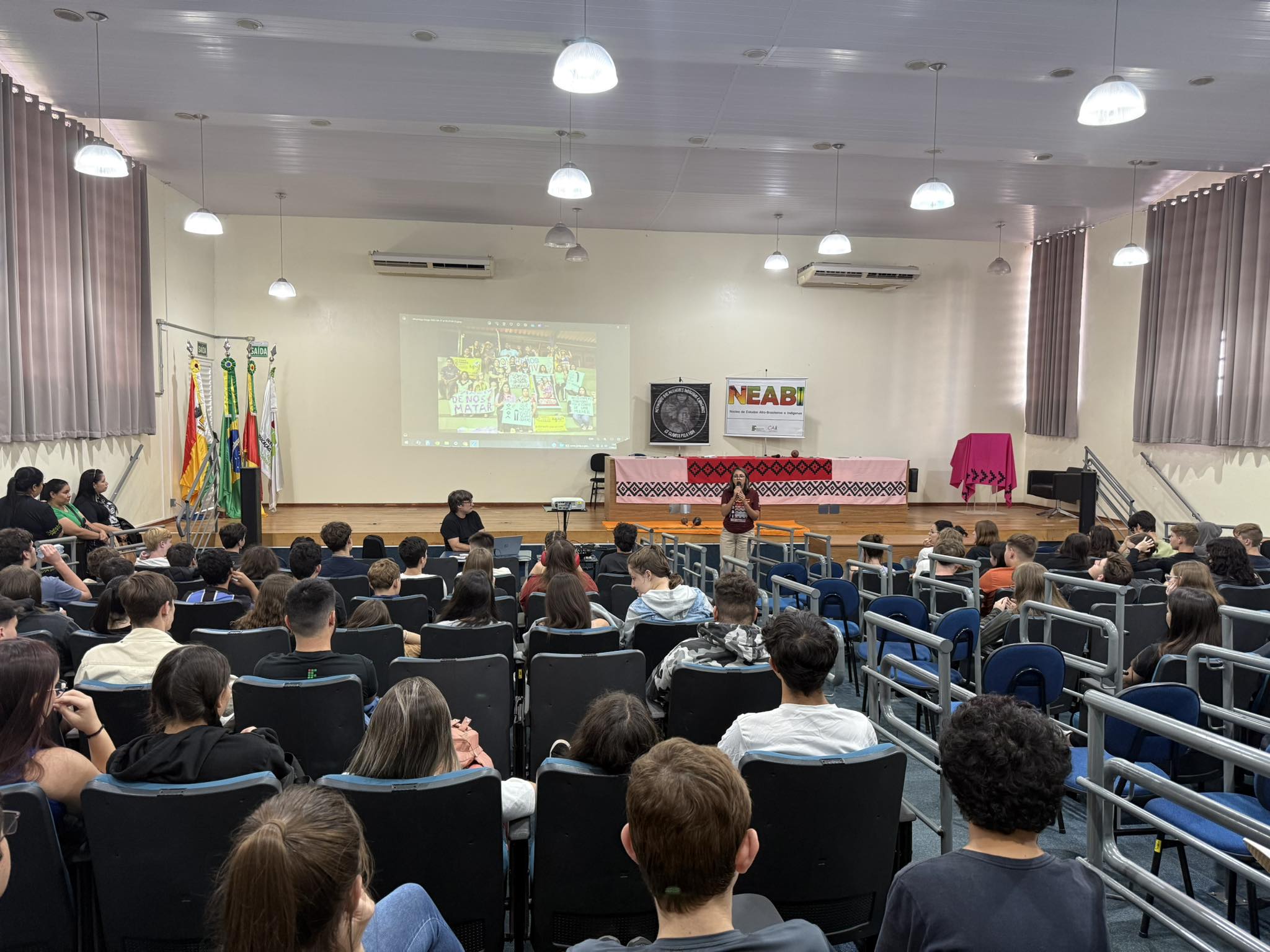 O Núcleo de Estudos Afro-brasileiros e Indígenas (Neabi) do IFFar – Campus Santo Augusto, promoveu nesta quinta-feira, 17 de abril, um evento alusivo ao Dia dos Povos Indígenas (19 de abril) e ao Dia da Terra (22 de abril), com o tema “Vozes Indígenas em defesa da cultura, do território e da vida”. As atividades, voltadas para os estudantes dos cursos técnicos integrados ao ensino médio, foram divididas em dois momentos, pela manhã, às 9h50, e à tarde, às 13h30.