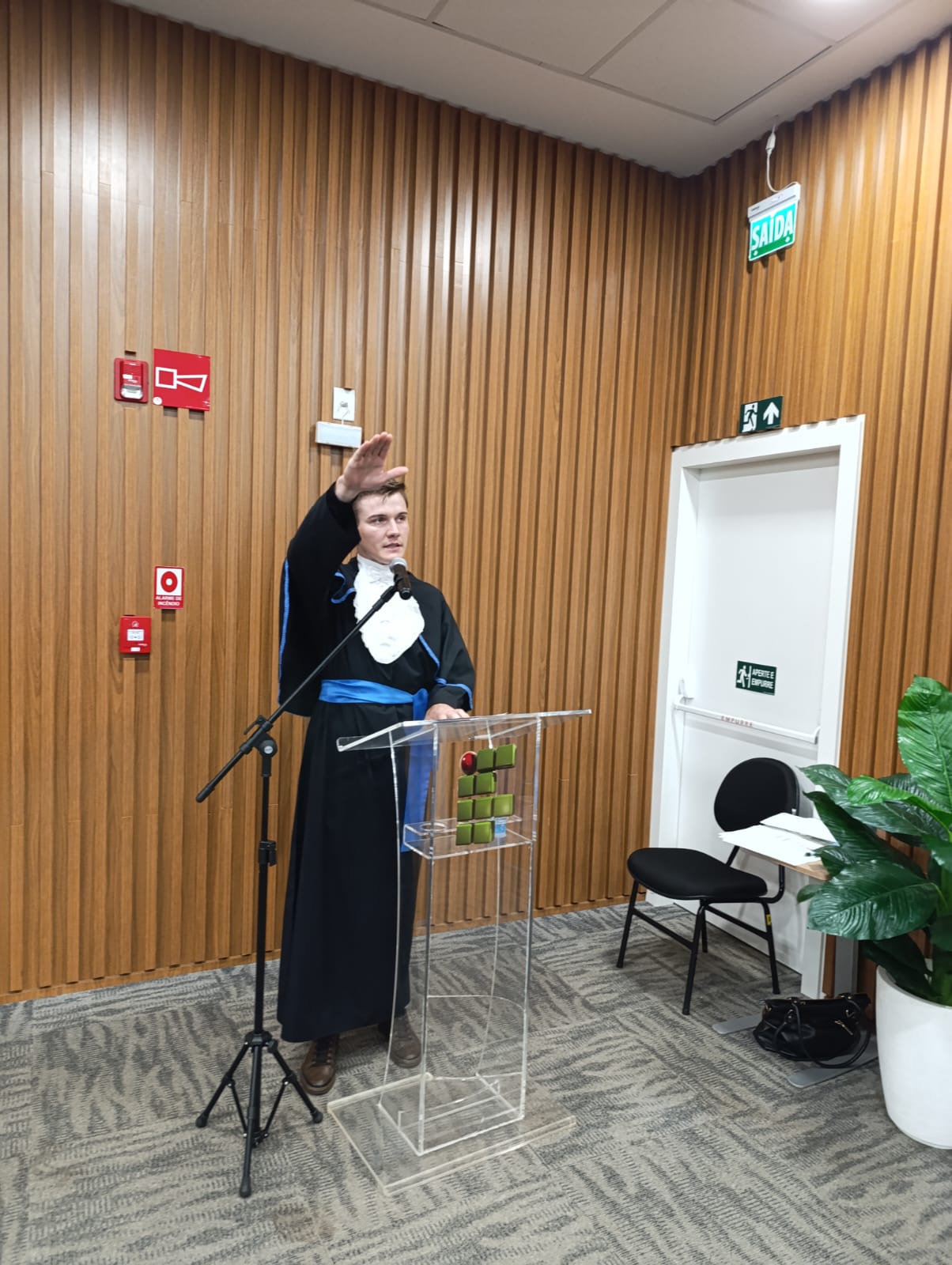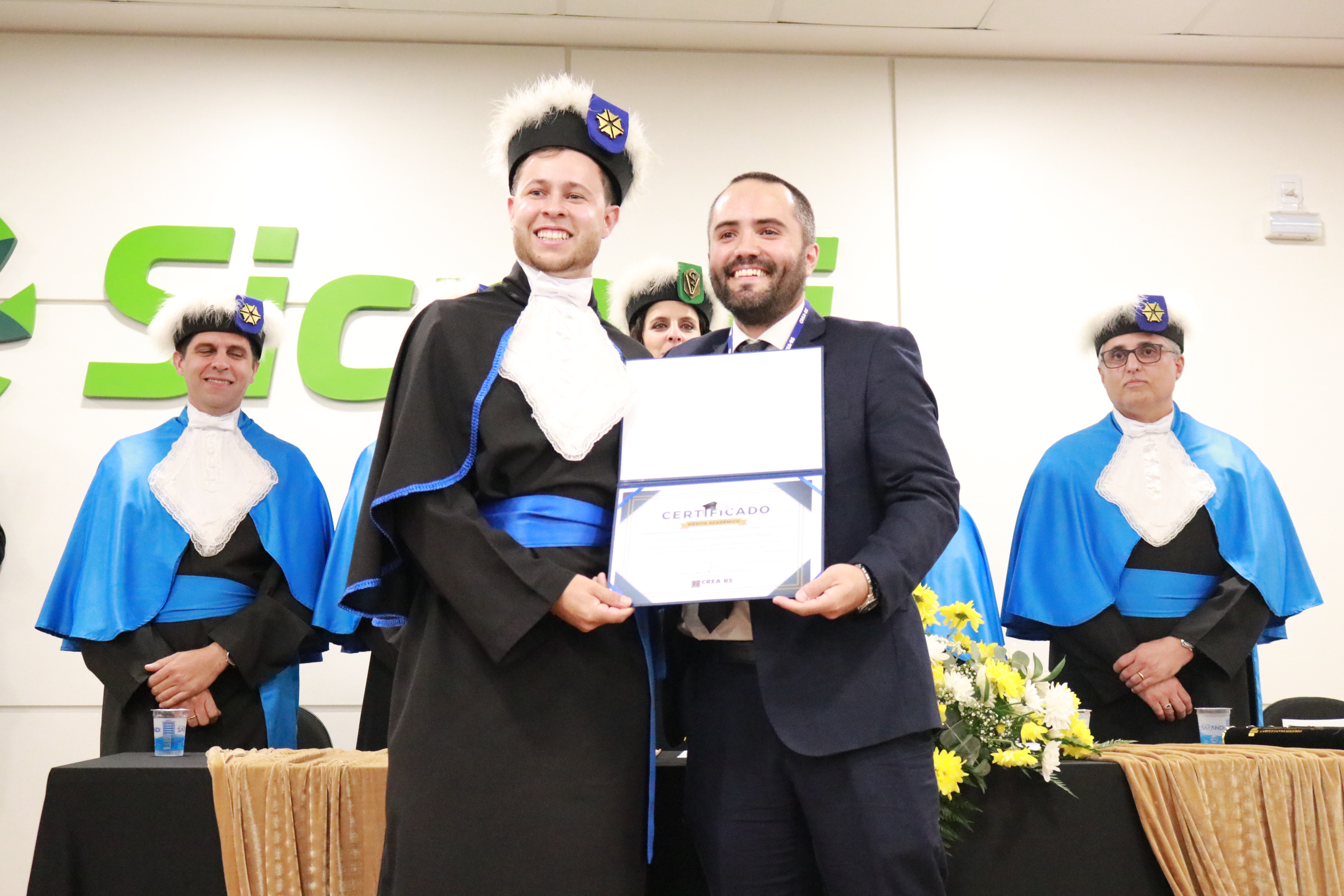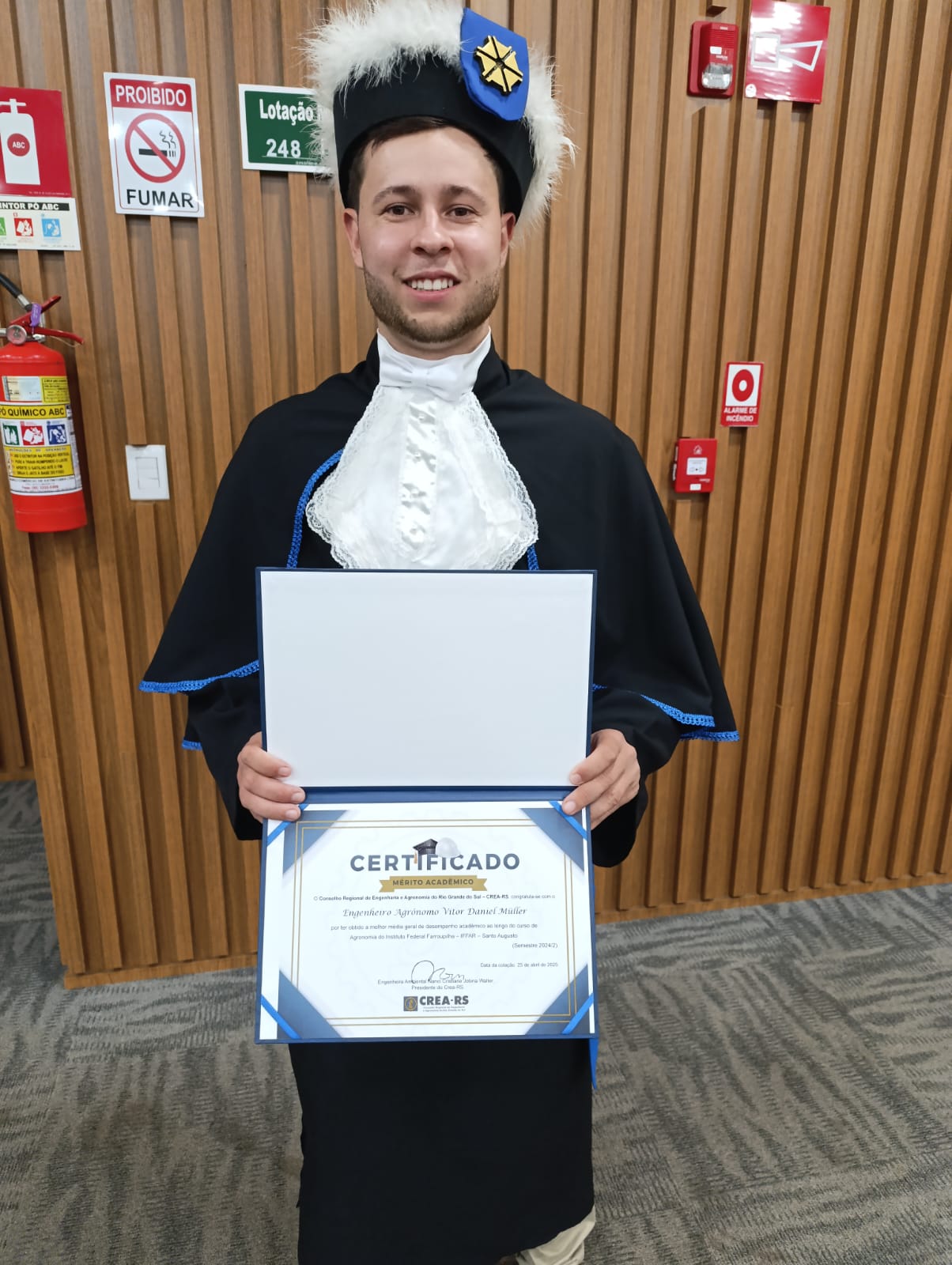 Durante a solenidade, os representantes dos CREA-RS e CRA/RS realizaram a entrega do Certificado de Destaque Acadêmico para o formando de Agronomia, Vitor Daniel Müller, e para a formanda de Tecnologia em Gestão do Agronegócio, Emanoeli Lansana.