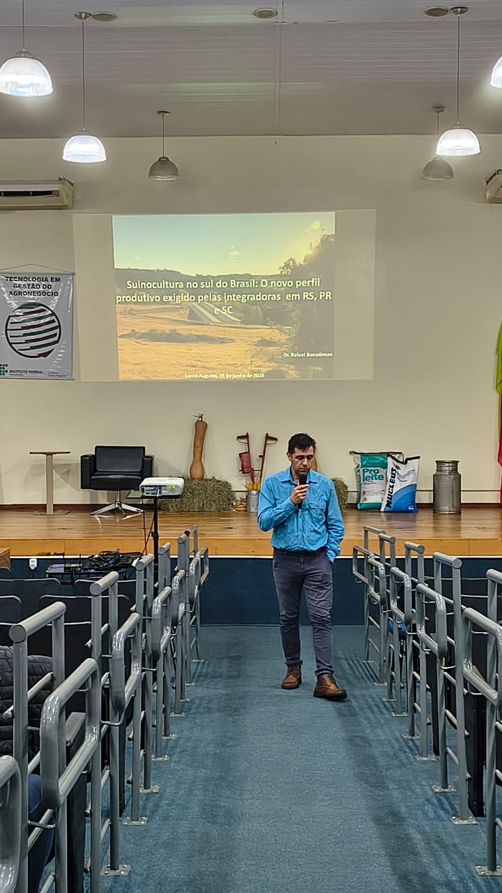 Na, quinta-feira, dia 05, aconteceu o encerramento do evento, com a palestra sobre "Suinocultura no Brasil: o novo perfil produtivo exigido pelas integradoras em RS, PR e SC", ministrada pelo professor Dr. Rafael Bonadimann.