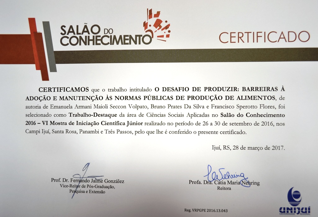 Na tarde de terça-feira, dia 28, foi realizada na Unijui a certificação dos Trabalhos Destaque do Salão do Conhecimento 2016, e os egressos do IFFar – Campus Santo Augusto, Emanuela Volpato e Bruno Prates Silva, foram premiados na VI Mostra de Iniciação Científica Júnior na área de Ciências Sociais Aplicadas com o trabalho: “O Desafio de Produzir: barreiras à adoção e manutenção às normas públicas de produção de alimentos”.