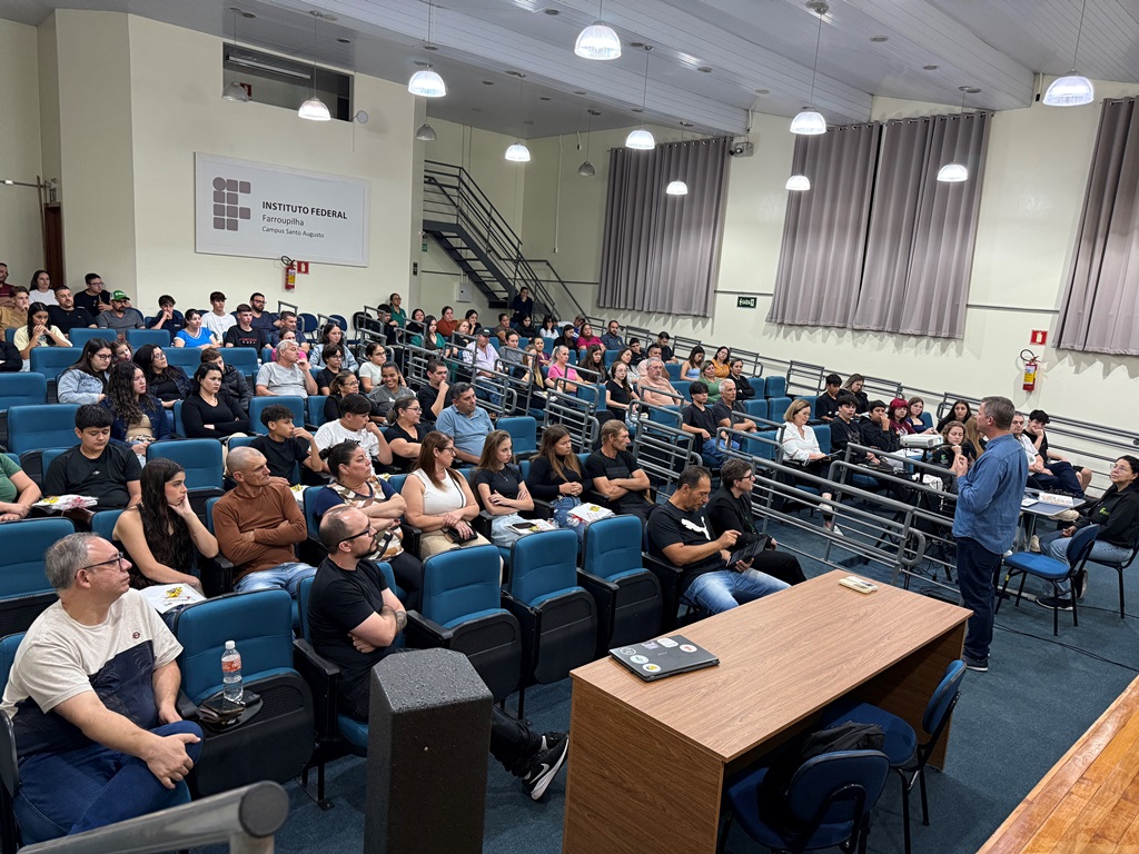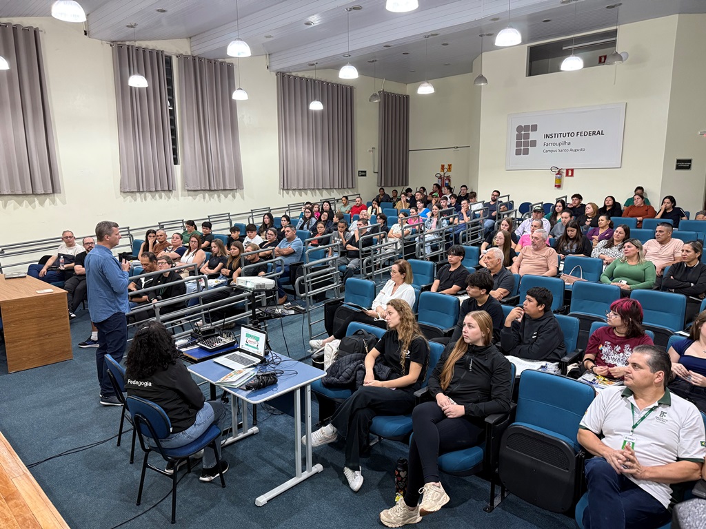 O IFFar – Campus Santo Augusto deu início, na noite do dia 13 de abril, às 19h, no auditório da instituição, às atividades do Programa Partiu IF 2026. O evento contou com a participação da Diretora Geral, Márcia Fink; da Secretária Municipal de Educação de Santo Augusto, Eliane Paier; do coordenador local do programa, professor Carlos César Wyrepkowski; do coordenador da Assistência Estudantil, Marcos Wolmann Santos; além dos integrantes da equipe do programa, estudantes selecionados e seus pais ou responsáveis.