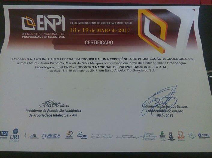 As professoras integrantes do Núcleo de Inovação e Tecnologia - NIT do IFFar - Campus Santo Augusto, Me. Maira Fátima Pizolotto, do Eixo de Gestão e Negócios, e Drª. Marieli da Silva Marques, do Eixo de Recursos Naturais, tiveram um artigo premiado no III Encontro Nacional de Propriedade Intelectual – ENPI. O evento foi realizado na URI em Santo Ângelo, nos dias 18 e 19 de maio.