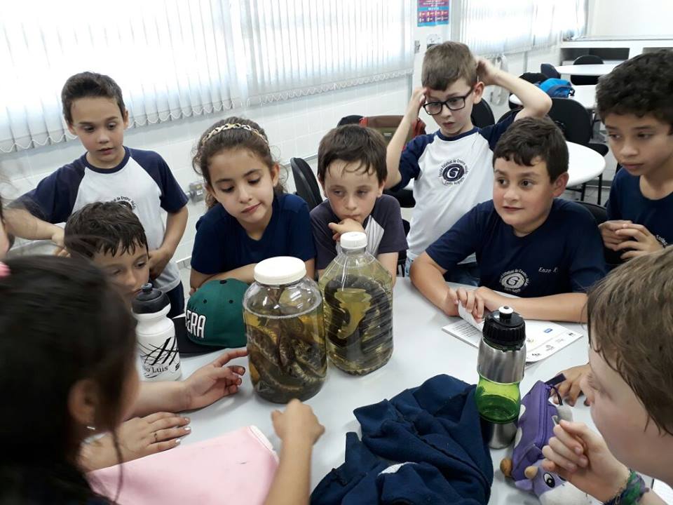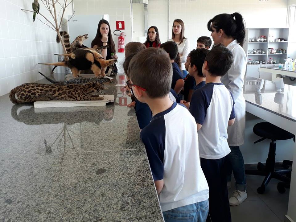 Em seguida, as crianças foram conduzidas até o laboratório de zoologia, onde puderam ver animais taxidermizados, como gambá, tamanduá e jaguatirica e também animais em vidro, como, aranha, sapo, gafanhoto, cobra, escorpião, lagarta, entre outros. As professoras das turmas aproveitaram a oportunidade para fazer perguntas sobre o nome dado ao grupo ao qual pertencem cada tipo de animal (répteis, anfíbios, mamíferos, peixes e aves), o que veio ao encontro de um dos objetivos do projeto, que é trazer assuntos familiares aos alunos.