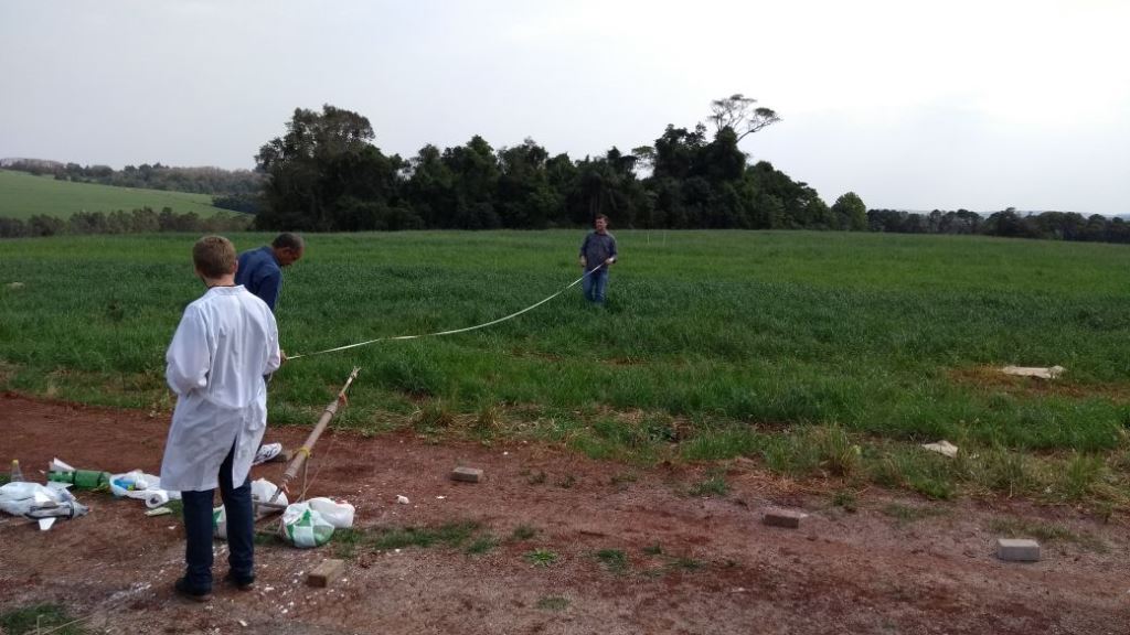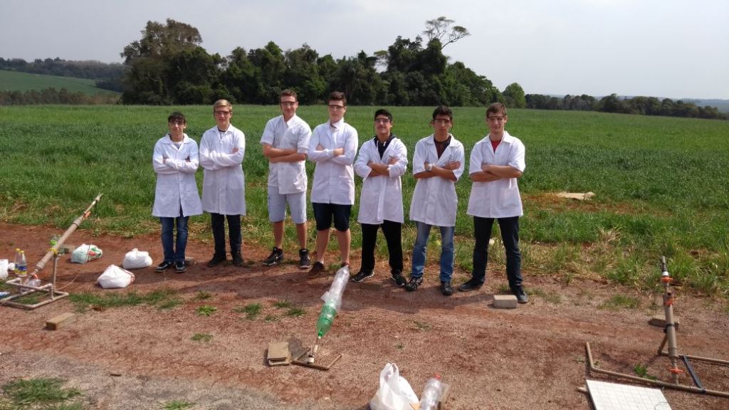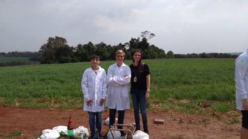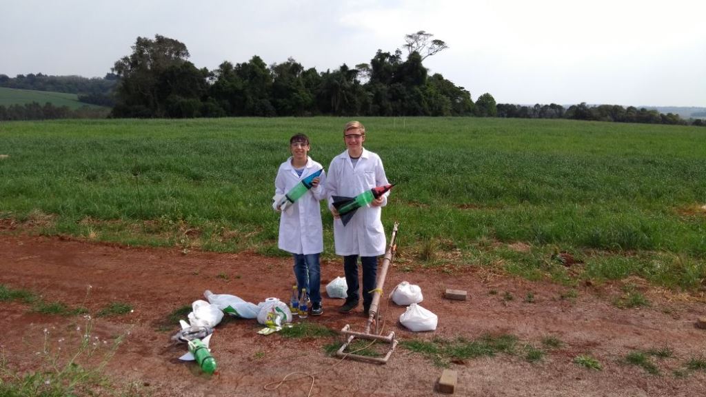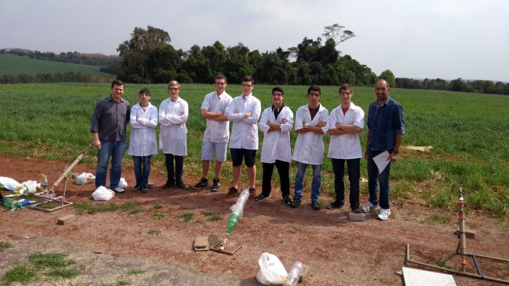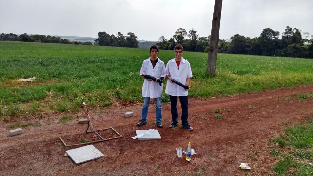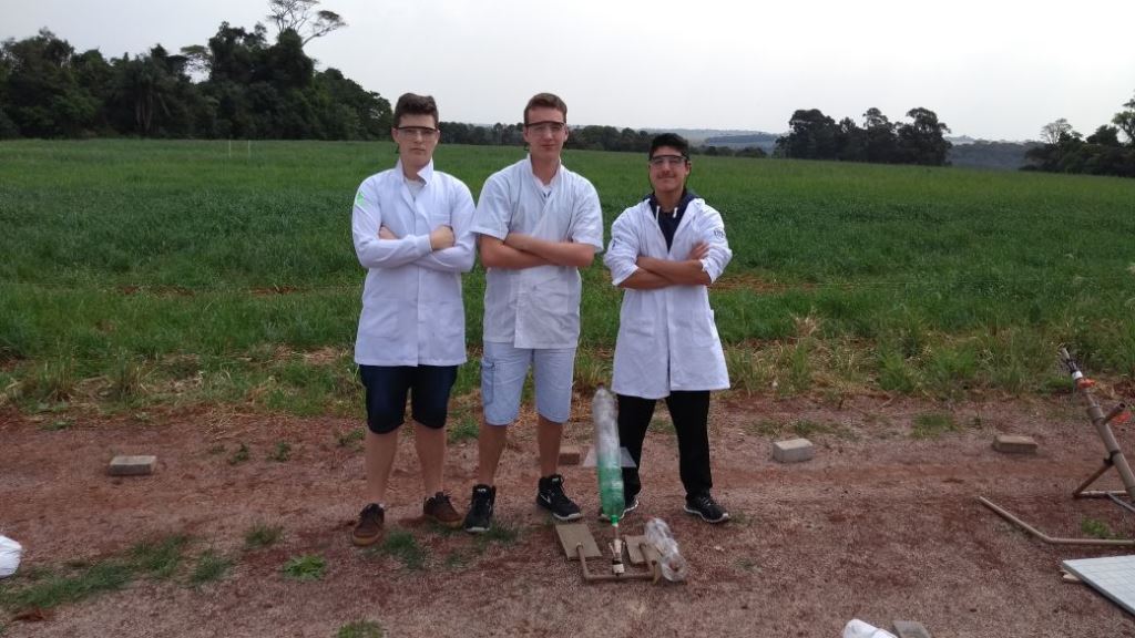 Equipe 2 APOLLO 1: integrantes: Alisson Jardel Ferri, Arthur Gustavo Wyrepkowski e Natalia Moura Brasil (1º ano do técnico em Informática) e a professora responsável Roberta Novaes dos Reis - Alcance do Foguete na classificatória 47 metros.