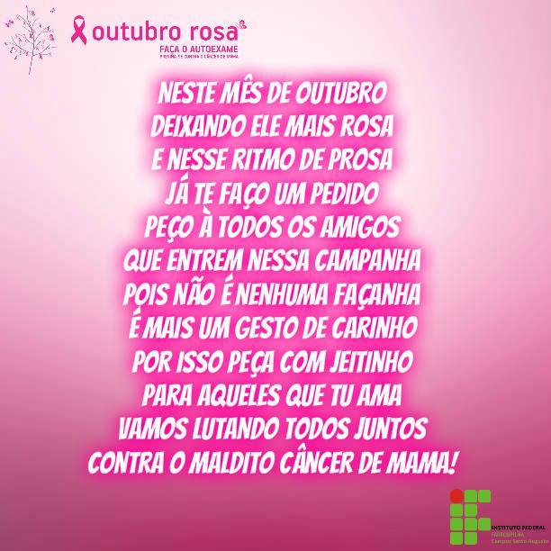 Os alunos do 2º ano do curso técnico em Administração do IFFar – Campus Santo Augusto, dentro da disciplina de Fundamentos de Marketing e Vendas, estudam o Plano Promocional de uma empresa na teoria e as estratégias de divulgar uma empresa/marca/produto, mas dessa vez a ideia foi apoiar o combate ao câncer de mama, auxiliando a divulgando do Outubro Rosa.