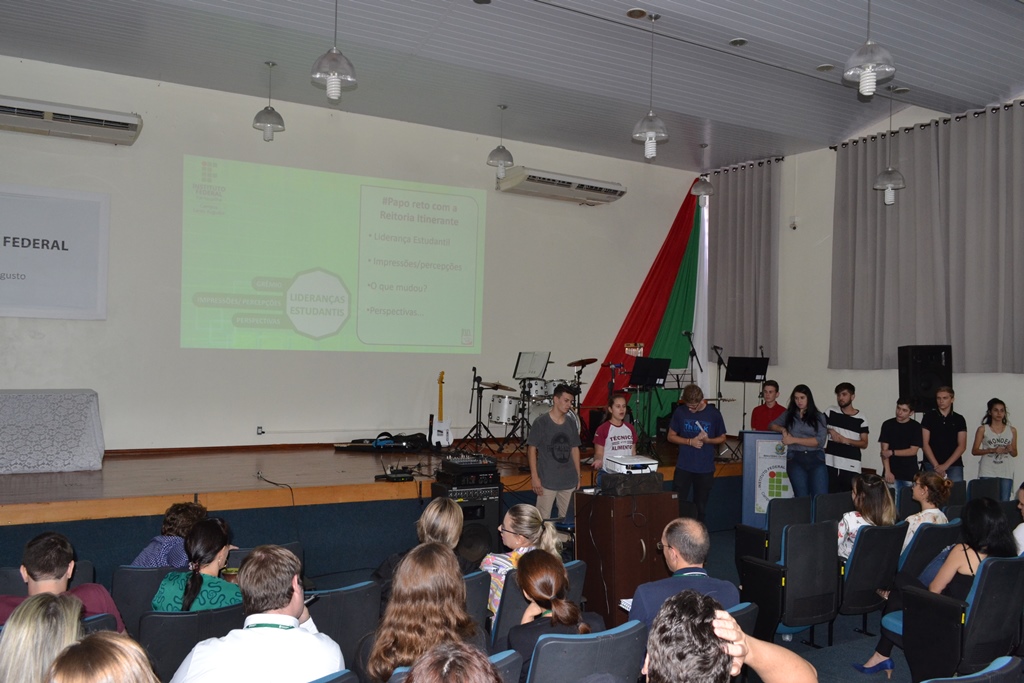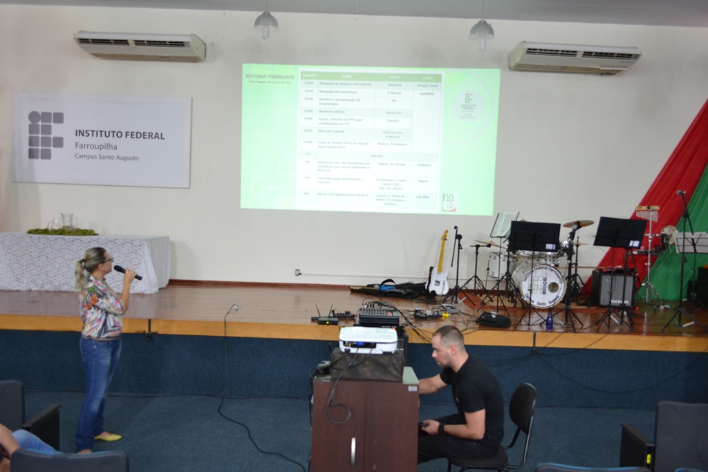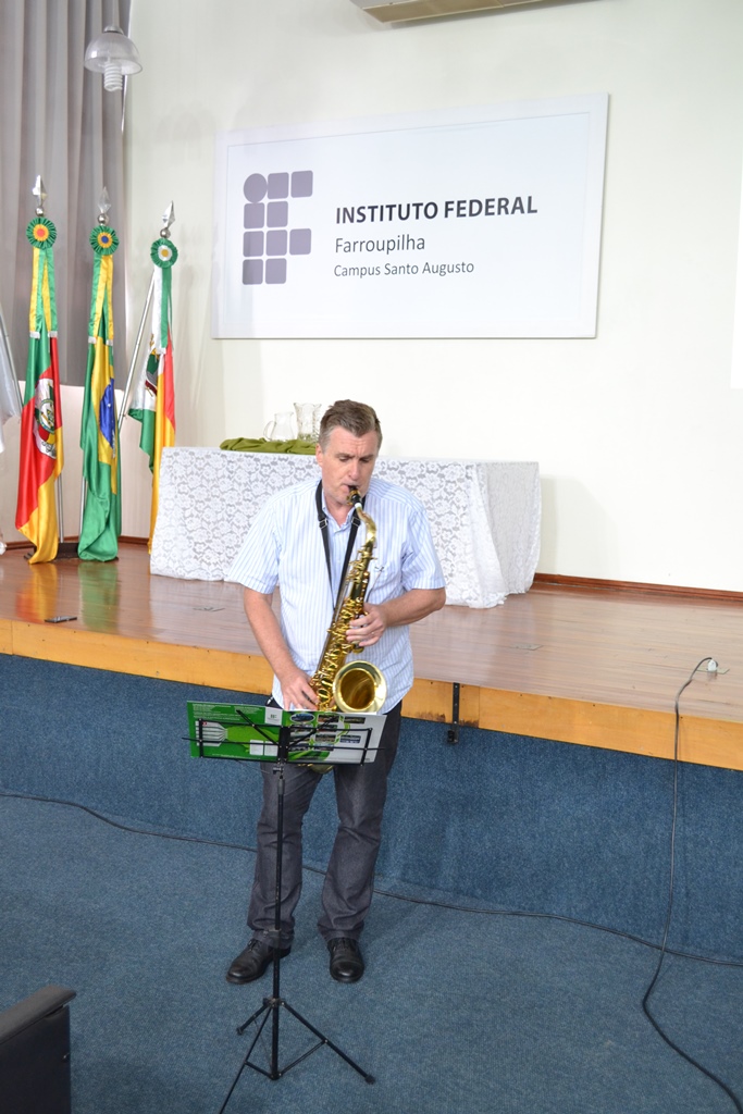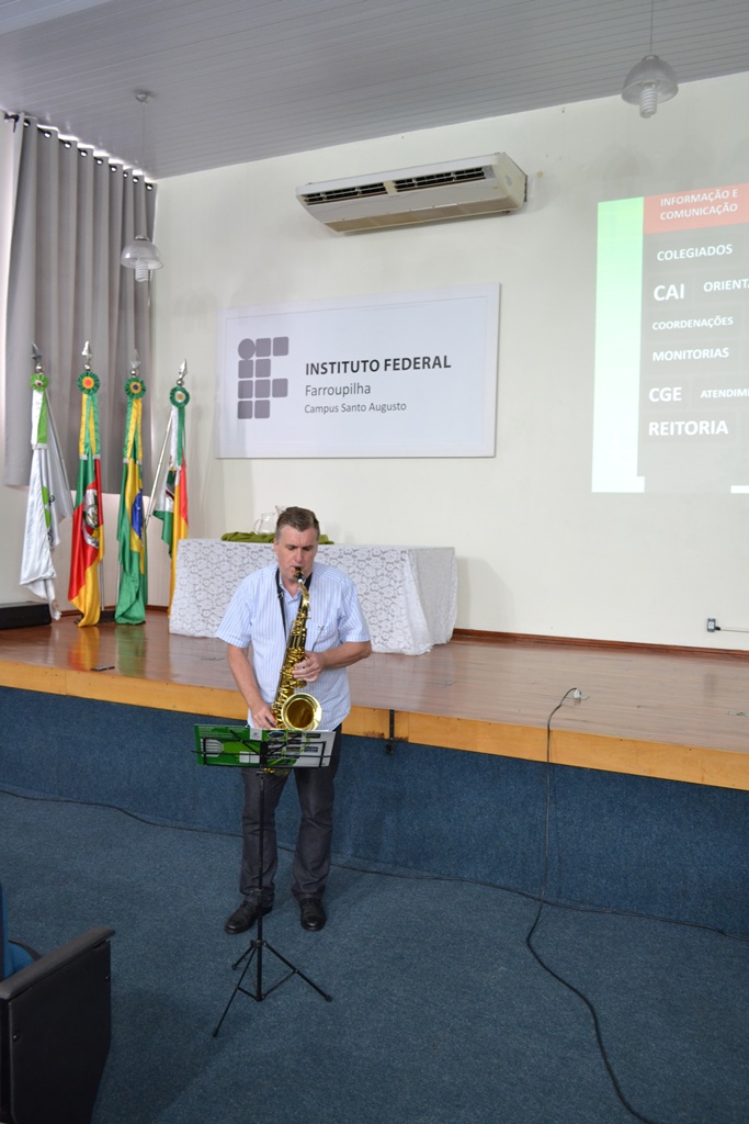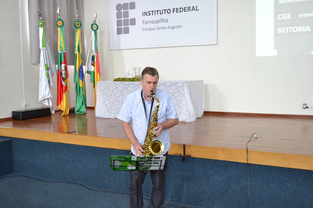 Na ocasião, a equipe da Reitoria e os servidores do campus foram recebidos no auditório da Instituição com a apresentação da Banda IF Musical.  Na sequência, após a abertura da programação pela Diretora Geral, Verlaine Gerlach, houve um momento cultural, onde o professor Dirceu Dirk tocou no saxofone a música “We are the Champions”, encantando a todos com a apresentação.