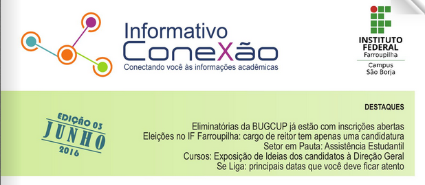 Já está disponível a 3ª edição do Informativo Acadêmico Conexão. O periódico produzido especialmente para o público discente traz como matéria principal, já na primeira página, as duas candidaturas à Direção Geral do IF Farroupilha – Campus São Borja.
